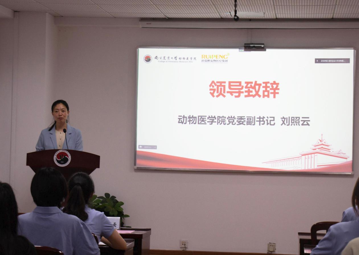 会议开始,刘照云致欢迎辞,热烈欢迎新瑞鹏集团前来学习交流。刘照云副书记表示自开学以来,虽然因为疫情大家都被封控在学校中,生活和工作都收到了巨大影响,但大家学习的热情却丝毫不减。而为了有效促进宠物医疗及美容等行业人才的健康发展,促进行业、企业与学校的合作,南农动医院联合新瑞鹏宠物医疗集团在这里举行“学院第五届瑞鹏班开班仪式”。因为疫情防控要求,本届瑞鹏班采取线上线下的方式进行。