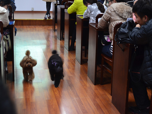 这次讲座的主题是宠物美容。周燕妮老师讲述的第一部分是关于宠物美容的基础认知。她以贵宾犬为例,详细介绍了宠物犬种的标准,涉及到犬只身高,牙齿数目及其咬合方式等方面。第二部分主要是宠物美容工具的简单认识。她先以PPT的形式向我们介绍了宠物的护理用品、修剪工具的种类以及它们的用途,然后现场使用部分工具,向学生们演示了如何为狗狗掏耳朵,如何给狗狗扎发髻。讲课内容包含许多实用的小经验,涉及到如何分头发、控制皮筋的位置等,讲座的氛围活跃。