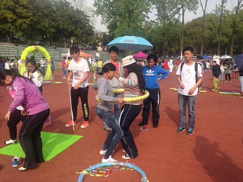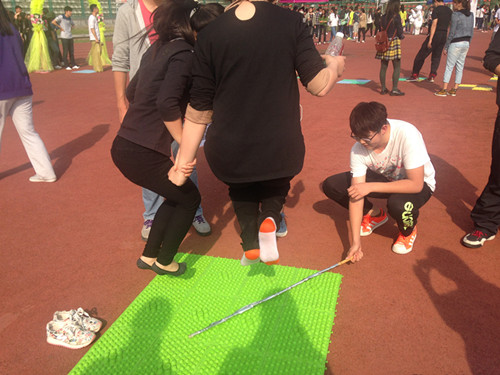 活动开始后,在动医院的比赛区前,各院的参赛者都跃跃欲试。体育二部的同学详尽地为他们解释比赛的流程和规则。动医的“三走”需两人参加,分为六个环节。第一环节是魔力陀螺,参赛者之一需弯腰捏鼻子做大象转10圈。很多参赛者10圈下来已经晕头转向,分不清东南西北了。第二环节是独木桥,参赛者需按照跑道上胶带所粘贴的轨迹行走,不得踩线,否则重新开始。这一关参赛者都轻松通过。第三环节是匍匐前进,参赛者之一需从圆桶中钻过。这一关对众多参赛者来说也是很轻松的。第四环节是疯狂指压板,参赛人两人都需站在板上,下面工作人员拿杆干扰,跳过五次算通过。这一环节需要参赛者掌握好起跳的节奏,不过大部分参赛者也是一次通过。第五环节是双人呼啦圈,参赛者需两人抱在一起转呼啦圈,共转三个,掉落则重来。大部分参赛者在这一关栽了跟头,囧相百出,惹得围观群众哈哈大笑。第六环节是拿杆盖章,参赛者不得越线。有不少身材娇小的女生在这一关显出了劣势,男生则占尽优势。动医院的比赛也吸引了不少外国友人或驻足观看,或上场挑战。现场一片欢声笑语。