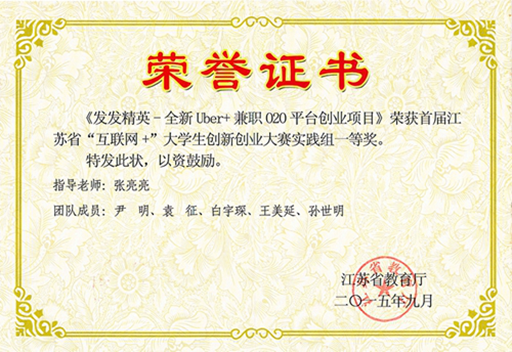 9月14日,首届江苏省“互联网+”大学生创新创业大赛决赛在南京落幕,我院袁征、白宇琛两位本科学生参与的“发发精英——全新Uber+兼职O2O平台创业项目”从全省95所高校的1622件项目中脱颖而出,获一等奖,以实践组第二名的成绩与其他15支项目团队共同组成江苏代表队,参加全国总决赛。