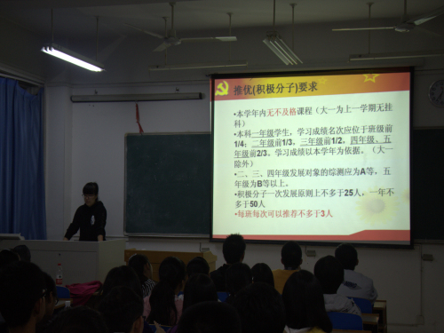2015年10月10日18点30分,动医院组织发展中心于教学楼A202、A204召开了“新生入党知识教育”宣讲会。参加此次宣讲会的有动医院2015届全体新生及组织发展中心成员,本次宣讲会按本一支部、本二支部分为两个会场,分别由两位团委组织发展中心副部张琪和刘欣媛进行了讲解。
