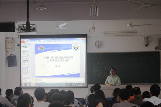 本次论坛旨在为广大青年学者提供展示和交流学术观点的平台,通过跨学科交流,有效推动学科间的交叉互补和共同发展。本期论坛学术演讲由青年教师周斌及博士研究生蔡德敏、包银莉、Alam、薛俊欣、戴建军六人担纲,并分别作了题为《猪Mx1蛋白体内抗猪瘟病毒研究及其突变体活性分析》、《母猪妊娠期日粮添加甜菜碱对新生仔猪肝脏脂肪酸合成的影响及其表观遗传机制》、《致新生儿脑膜炎大肠杆菌抗菌酶机制的研究》、《Effect of Selenium enriched probioties on meat quality, antioxidants capacities and expression of heat shock proteins in broiler chickens under heat stress conditions》、《弓形虫急性感染血液相关标志蛋白的筛选及其作用机理研究》和《猪卵泡细胞玻璃化冷冻后的细胞凋亡及凋亡模式研究》的专题演讲。他们就各自的研究背景、问题假设、试验设计、研究结果等几个方面细致地阐述其从事的科研项目。报告人畅所欲言,与会者踊跃发问,学术评审委员现场提问并发表自己的学术观点、问题和建议,充分实行互动交流。论坛期间气氛活跃,热烈,轻松,呈现出科学创新技术奇葩争奇斗艳,百家争鸣的浓厚学术交流氛围。