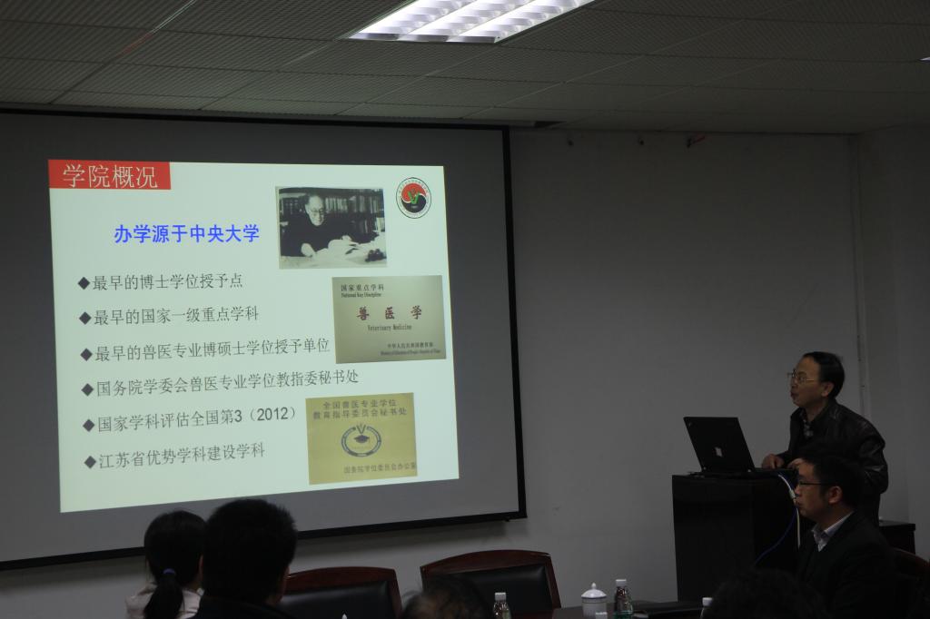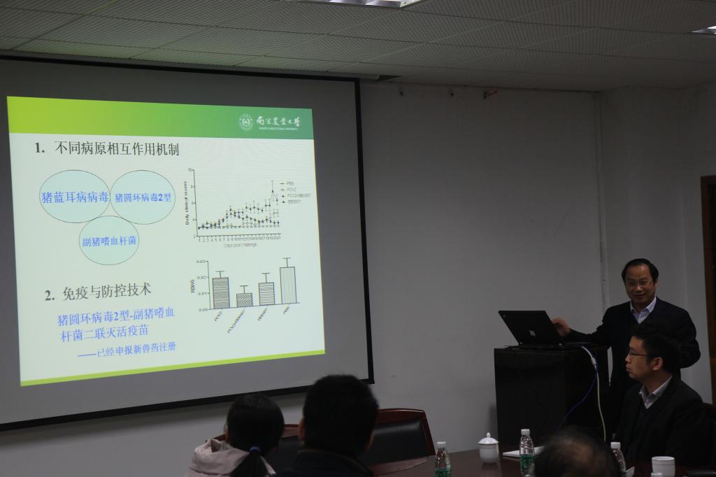 在随后召开的教授座谈会上,院长周继勇教授首先就我院的发展历史、学科状况、科研基地平台、“十二五”期间的科研情况进行了汇报。随后,基础兽医学系主任赵茹茜教授、预防兽医学系主任姜平教授、临床兽医学系主任黄克和教授分别汇报了各系的师资队伍、“十二五”科研成果及其研究特色。听完汇报后,两位领导对我院取得的科研成绩给予了充分肯定,并就我院的科研工作给予了指导,同时介绍了国家科技体制改革的情况、政策、动态以及重点研发计划情况,希望我院整合优势资源,积极申报相关重点研发专项项目。