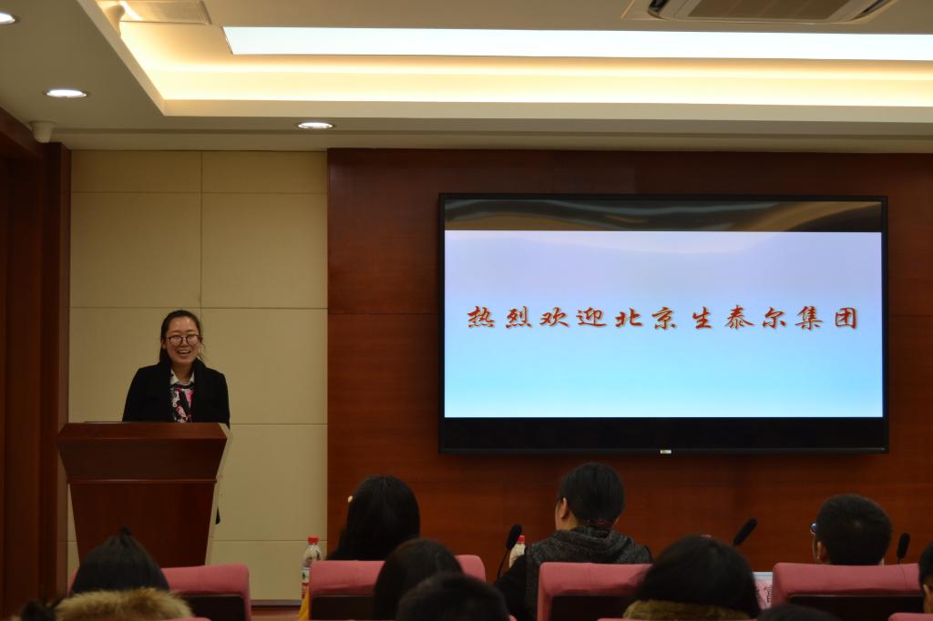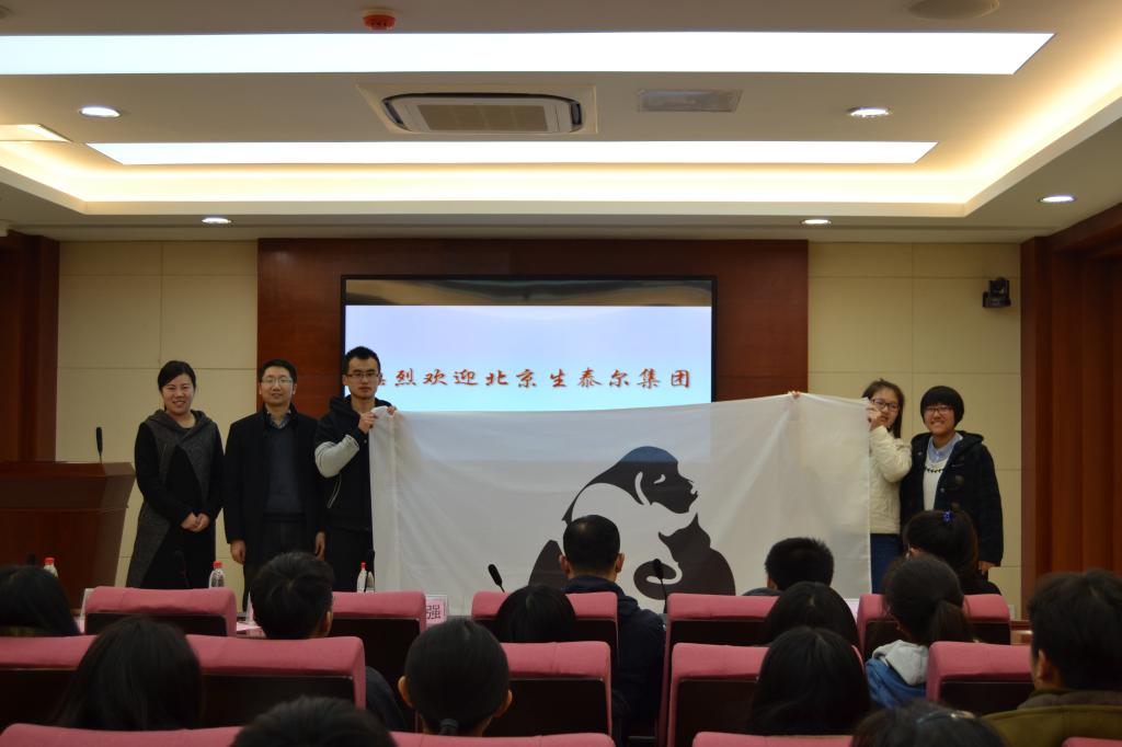 熊富强说,生泰尔公司的经理王达先生和蔡玮先生是我院08级校友,是早期生泰尔班的成员,他们的成功,体现了生泰尔班的优势性,也展现出校企合作在培养卓越兽医人才中的优越性。王达先生和蔡玮先生讲述了生泰尔班的培养目标和培养方案,并向在座的动医学子讲述了他们成功的经验。王亚文女士围绕生泰尔集团,生泰尔班培养计划给在座同学做报告,并通过一系列图片和数据,加深动医学子对宠物行业的了解。