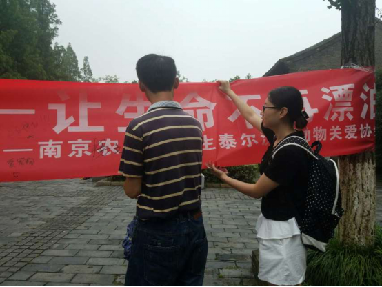 7月14上午,南京农业大学生泰尔流浪动物关爱协会暑期社会实践团全体来到了白鹭洲公园进行宣传活动。