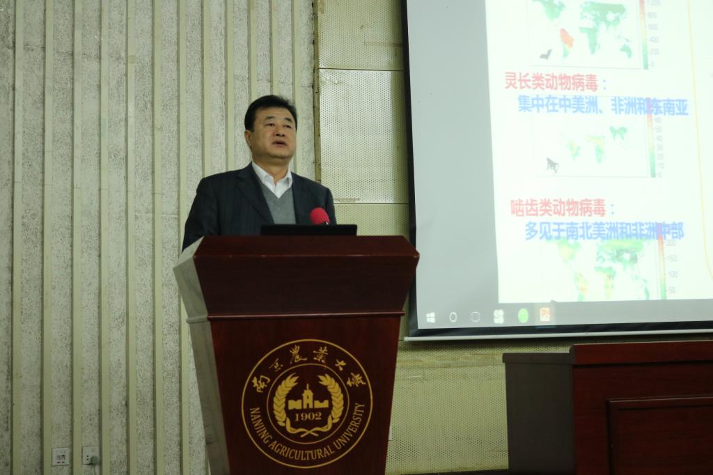 活动伊始,周继勇院长致欢迎词,热烈欢迎金院士来我校进行学术交流。报告在热烈的掌声中拉开帷幕。金院士以《共患病毒病与综合防控》为主题,从兽医学、卫生学、公共卫生学三方面的角度来看待共患传染病的问题。其汇报内容分为共患传染病的概述、目前关注较多的共患传染病以及共患传染病的防控等三个版块。金院士从共患传染病的分类入手,说明了共患传染病演化的阶段性,详细从动物源性病原跨界传播快、病原体与宿主疾病演变、生态破坏与气候变化和全球化经济与饲养方式改变四个方面介绍了共患传染病的流行原因。