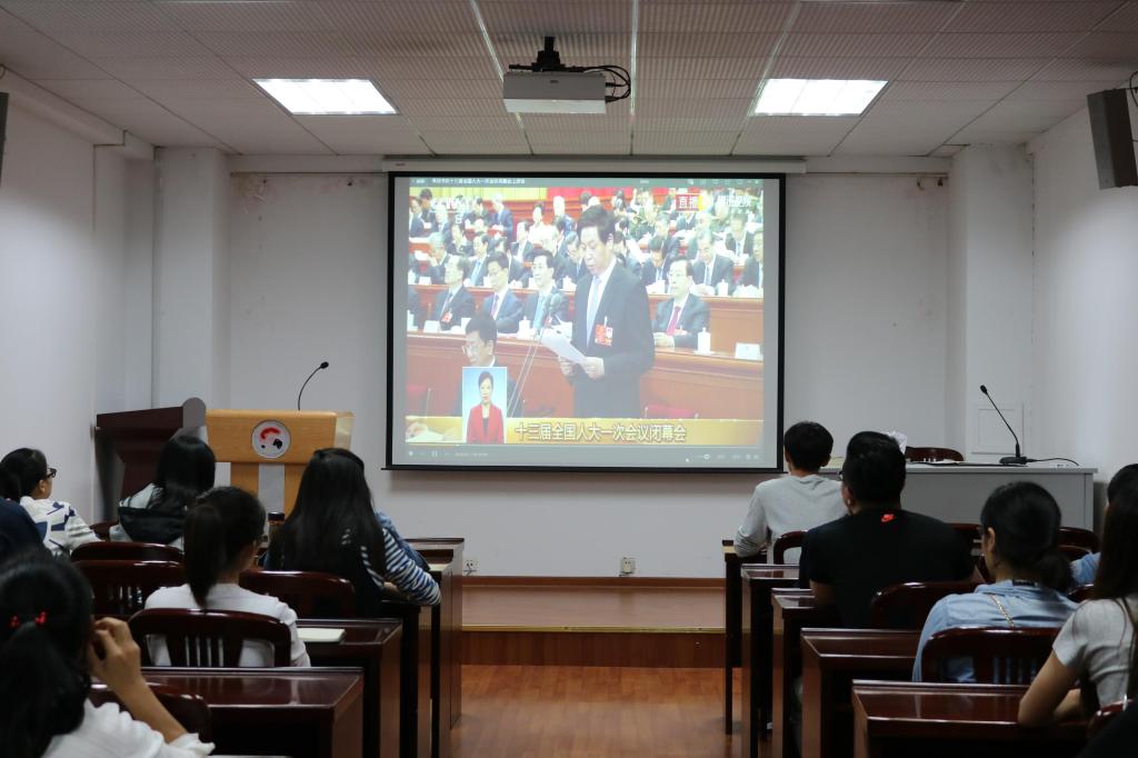 本次会议分为三个环节。首先与会人员观看两会现场视频,即3月20日在北京人民大会堂举行的第十三届全国人民代表大会第一次会议的闭幕会,大会执行主席、十三届全国人大常委会委员长栗战书主持闭幕会发表的讲话。