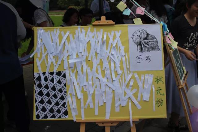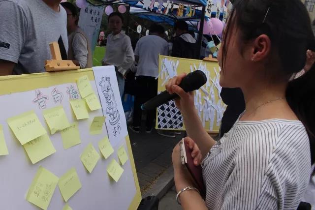 我院力源悦读俱乐部开辟了“状元榜”和“告白墙”两个展区。“状元榜”上挂满了印有难易不同的题目的纸条,前来参加活动的同学们只要从中随机抽取一题回答即可。回答正确则可盖上动医院印章;如回答错误,那就进入下一环节“告白墙”。“告白墙”环节中,同学们在便利贴上写下自己想说的话或者读书体悟,并通过麦克风勇敢大胆地念出来,同样可获得动医院印章。本次活动的开展,寓教于乐。将文学常识问题融入游戏之中,当我们在进行游戏时,同样丰富了我们的知识,一举两得。