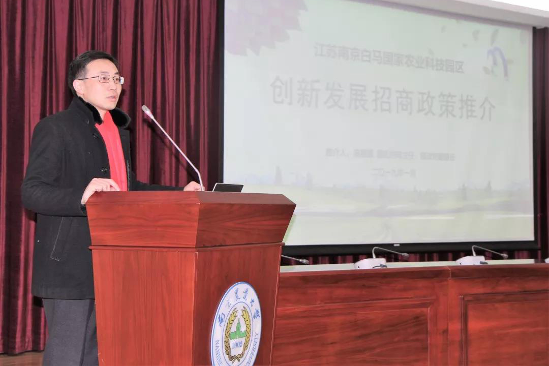 签约仪式之后,白马园区招商主任、副镇长施晨曦做白马园区创新发展招商政策推介宣讲。施晨曦就园区的历史与发展概况、主导产业、科技创新和政策保障等四个方面做了详细的介绍。