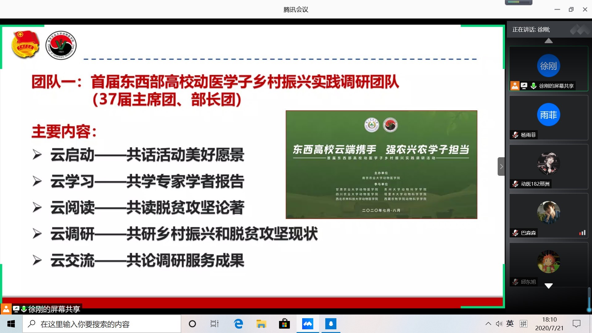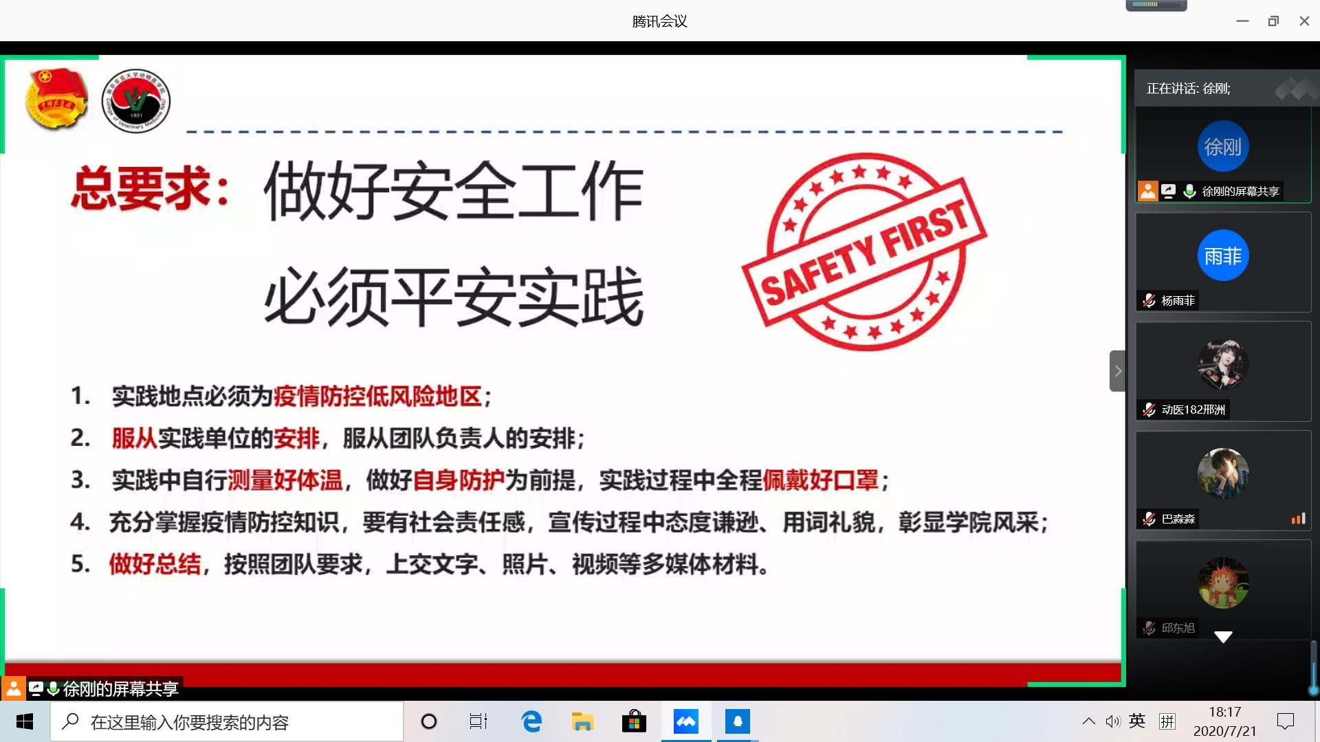 7月21日下午6:00,为响应“疫情防控”工作要求,我院2020年大学生志愿者暑期“三下乡”社会实践活动出征仪式,在腾讯会议云端召开。辅导员徐刚、李欣欣和2018级全体本科生参与了本次出征仪式。