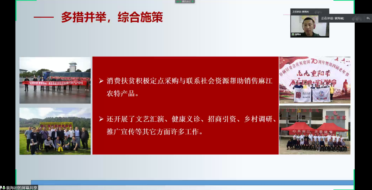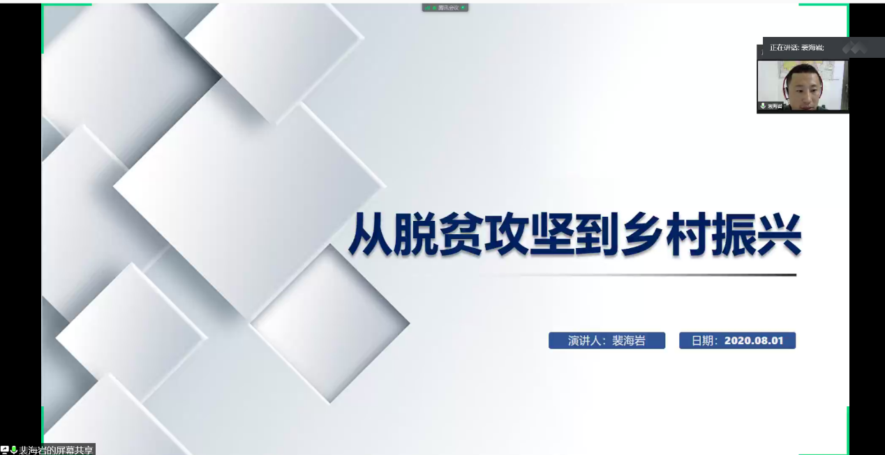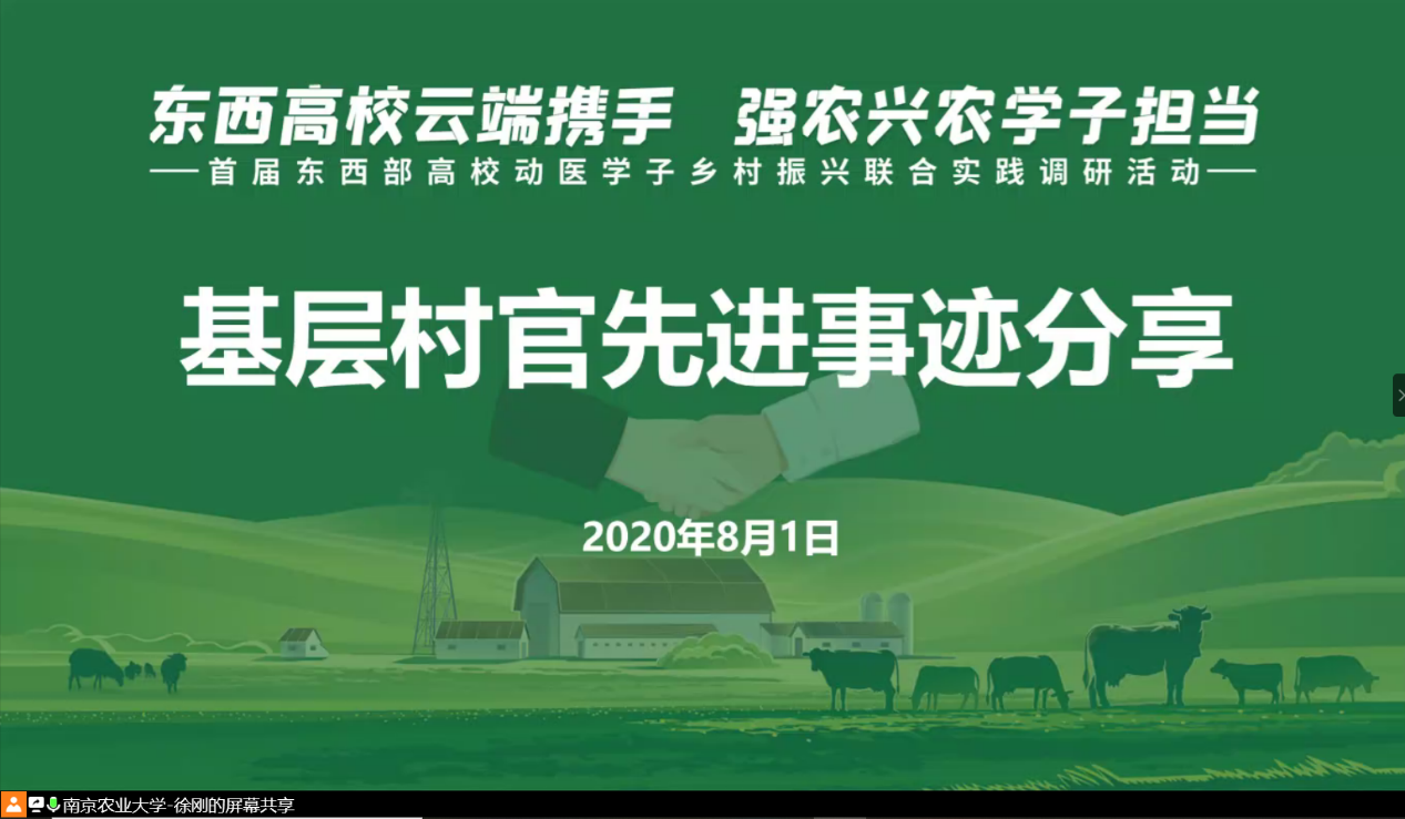 8月1日下午,由新葡萄8883官网AMG发起,联合东西部7所涉农高校共同开展的“东西高校云端携手,强农兴农学子担当”首届东西部高校动医学子乡村振兴联合实践调研活动,进行了线上的基层村官先进事迹分享会活动。三位基层村官讲述他们实地工作中与脱贫攻坚、乡村振兴的故事,分享会由辅导员徐刚主持。