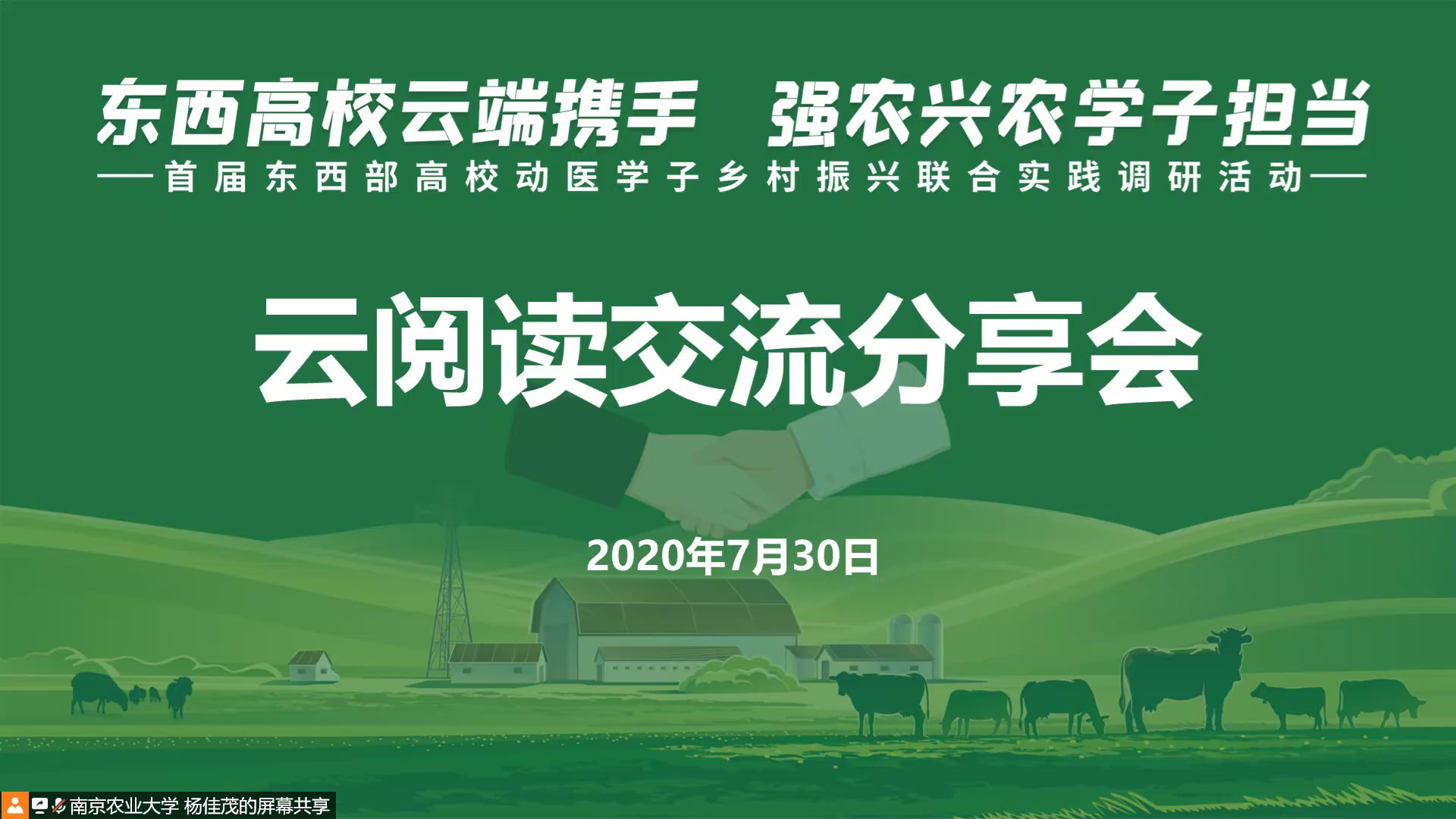 8月18日晚7:00,由新葡萄8883官网AMG发起,联合东西部七所涉农高校共同开展的“东西部高校云端携手,强农兴农学子担当”首届东西部高校动医学子乡村振兴联合实践调研活动,进行了“云阅读计划”读书分享会。