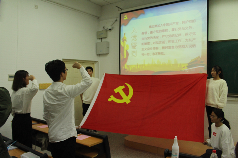 随后刘照云老师介绍了与会领导和嘉宾,宣读了2020年新发展党员的名单,在全体起立奏国际歌后,新发展党员面对党旗宣誓。