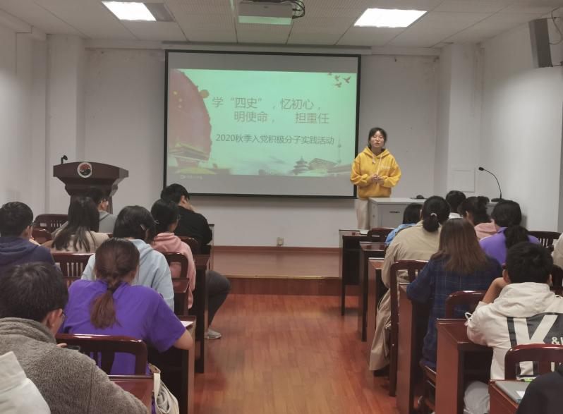 11月1日晚6:00,我院在逸夫楼3044会议室举行了以“学四史,忆初心,明使命,担重任。”为主题的2020年秋季入党积极分子实践活动,积极分子们积极主动参与了本次实践活动,收获颇丰。
