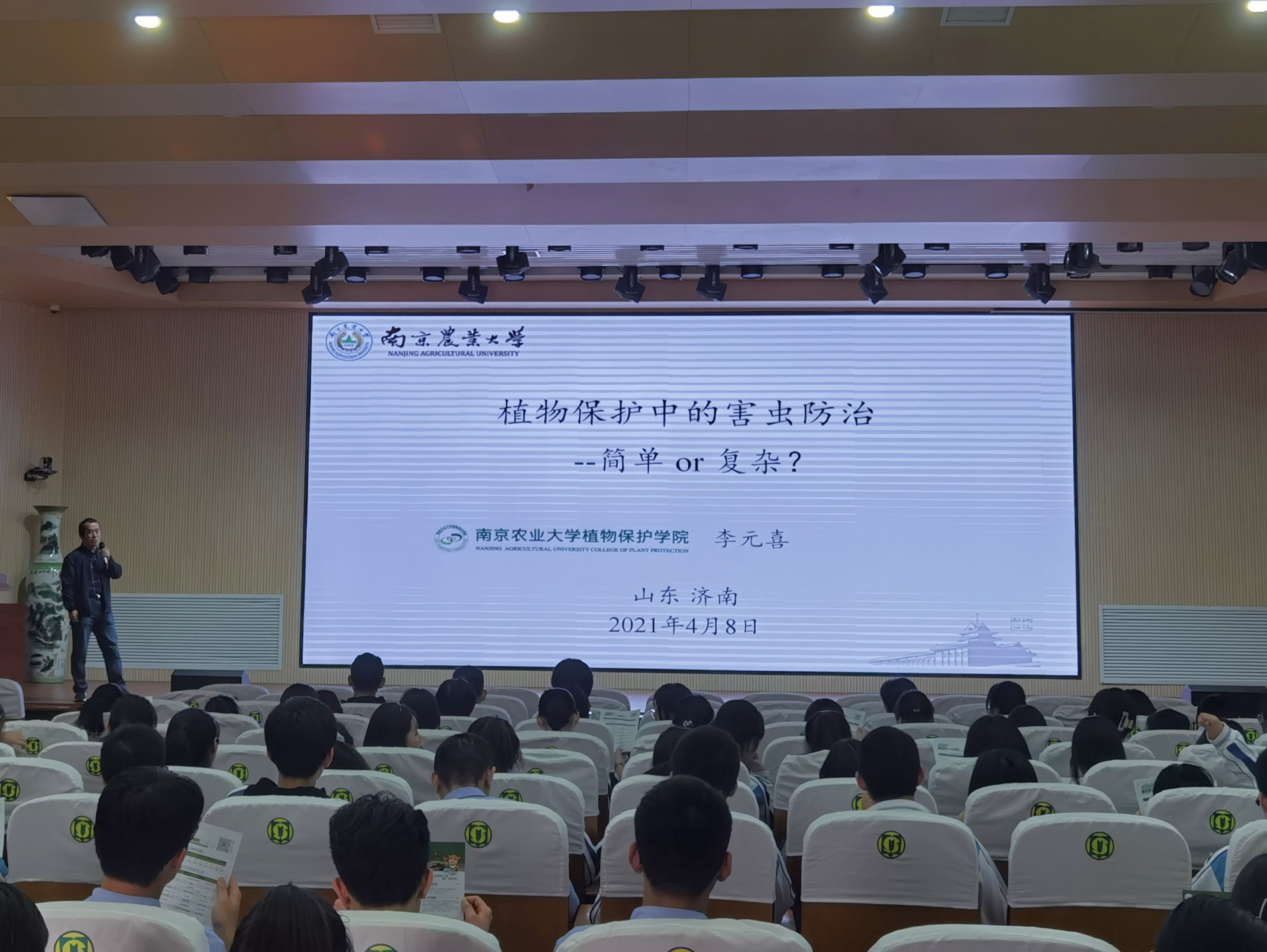 李元喜教授为山东省实验中学近300名学生作了题为《植物保护中的害虫防治——简单or复杂》的科普知识讲座。从身边的昆虫说起,利用3个案例,带领同学们走进神奇的昆虫世界,深入浅出、生动有趣的报告,赢得了在场学生的阵阵掌声。
