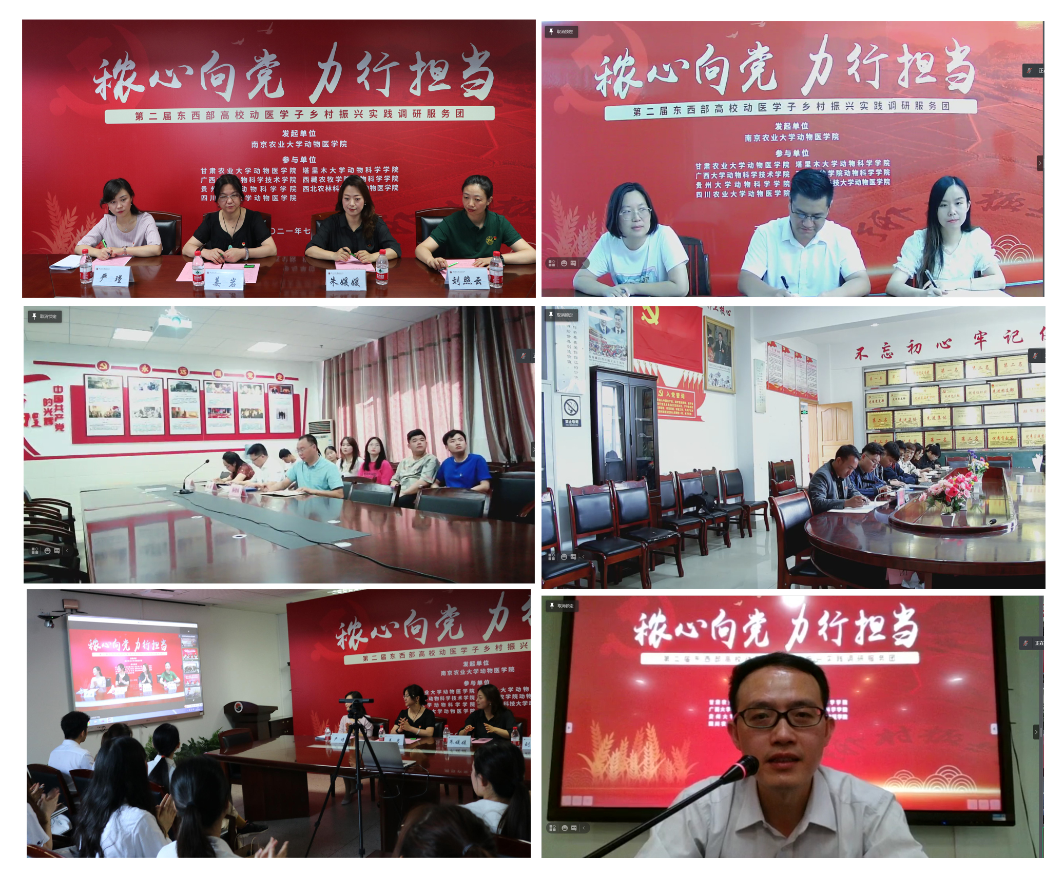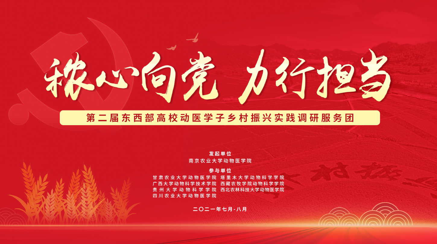 2021年是中国共产党成立一百周年,也是“十四五”规划的开局之年,是向第二个百年奋斗目标进军的开启之年。习近平总书记在中国共产党成立100周年大会上强调,一百年来,在中国共产党的旗帜下,一代代中国青年把青春奋斗融入党和人民事业,成为实现中华民族伟大复兴的先锋力量。为进一步响应新时代的中国青年要以实现中华民族伟大复兴为己任的召唤,加强涉农专业大学生“知农爱农”教育,培养“一懂两爱”人才。在暑期大学生开展社会实践活动之际,新葡萄8883官网AMG联合甘肃农业大学新葡萄8883官网AMG、广西大学动物科学技术学院、贵州大学动物科学学院、四川农业大学新葡萄8883官网AMG、塔里木大学动物科学学院、西北农林科技大学新葡萄8883官网AMG和西藏农牧学院动物科学学院8所涉农高校,共同启动开展了主题为“秾心向党,力行担当”第二届东西部高校动医学子乡村振兴实践调研活动。