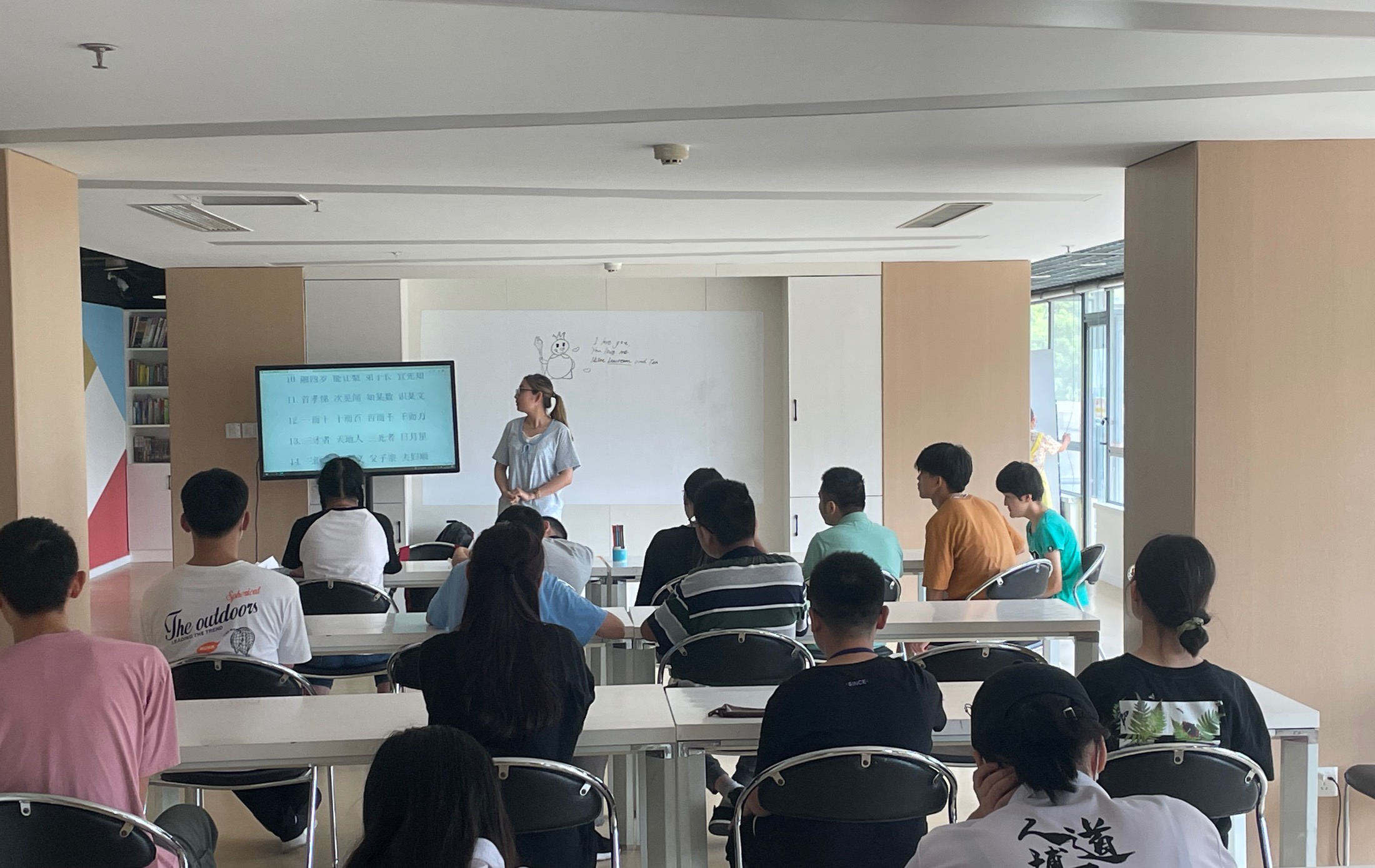 今天的活动分为两个部分。首先是经典诵读。由领读员李云同学带领学员诵读《三字经》。起初志愿者们都很担心学员会不配合造成冷场的尴尬局面,但随着领读声“人之初,性本善”的响起,所有的学员都跟着一起诵读,十分配合。有的学员还能够跟着领读员一起领读,带动大家的积极性。