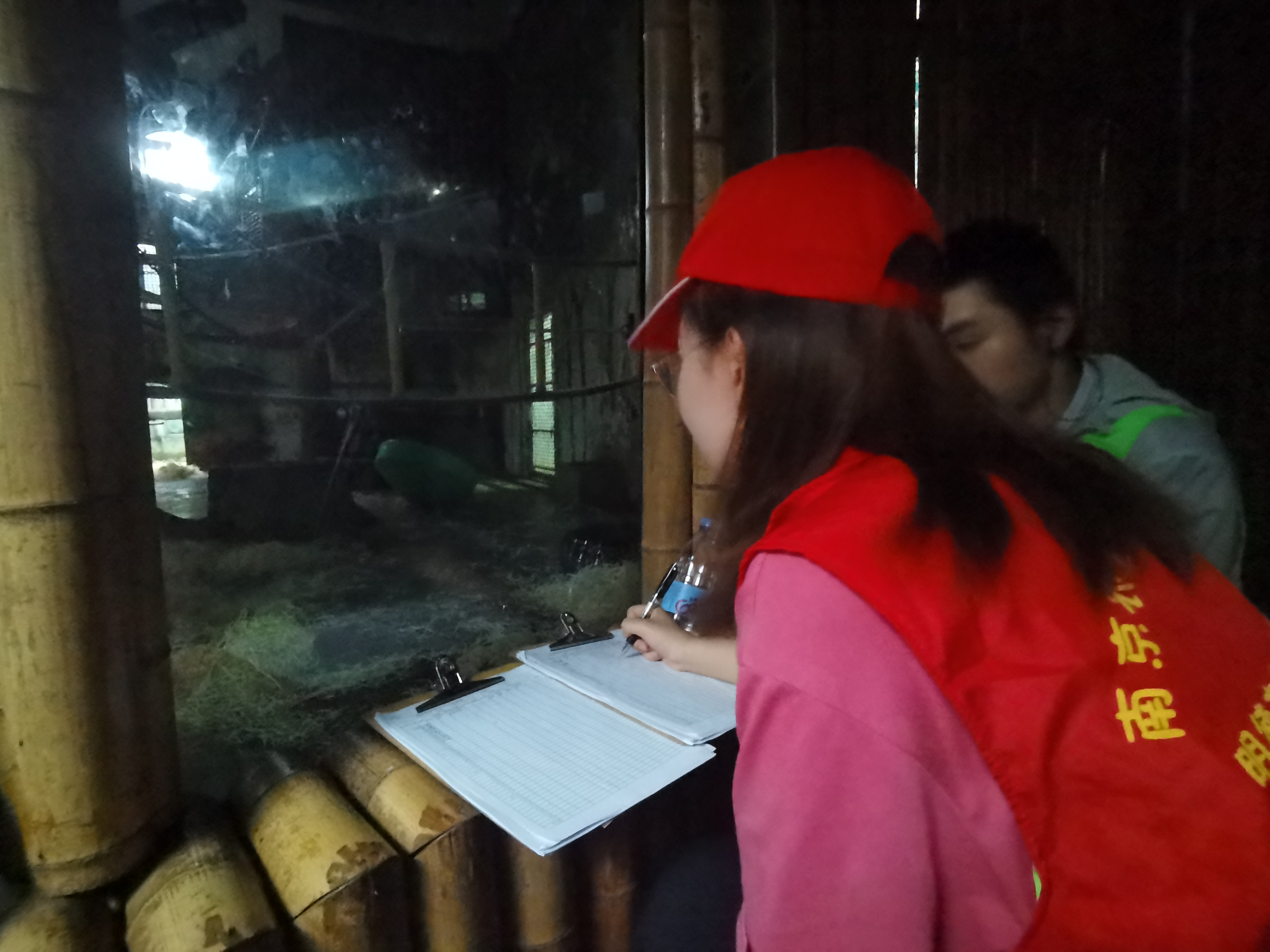 动物行为观察组负责观察并每隔三分钟,记录黑豆、乌豆和憨豆三只在人工培育不同时长的幼年黑猩猩行为,为研究幼年黑猩猩放归族群的最佳时间提供了基础数据。