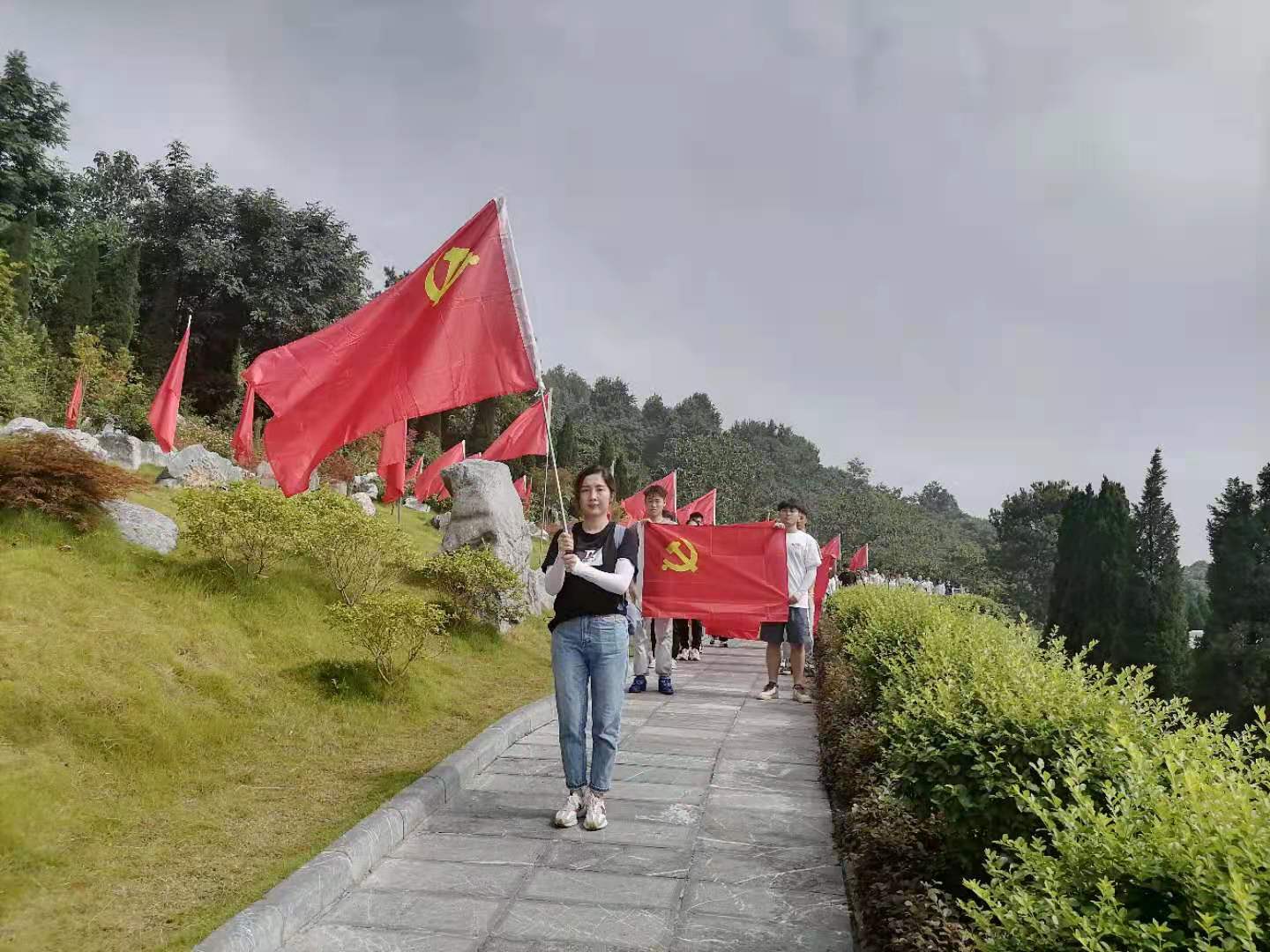 每个高校队伍都向烈士敬献花篮并整理花篮绸带,整理完毕,全员默哀一分钟。全体党员在烈士陵园前重温入党誓词,并举旗绕场一周,以寄哀思。