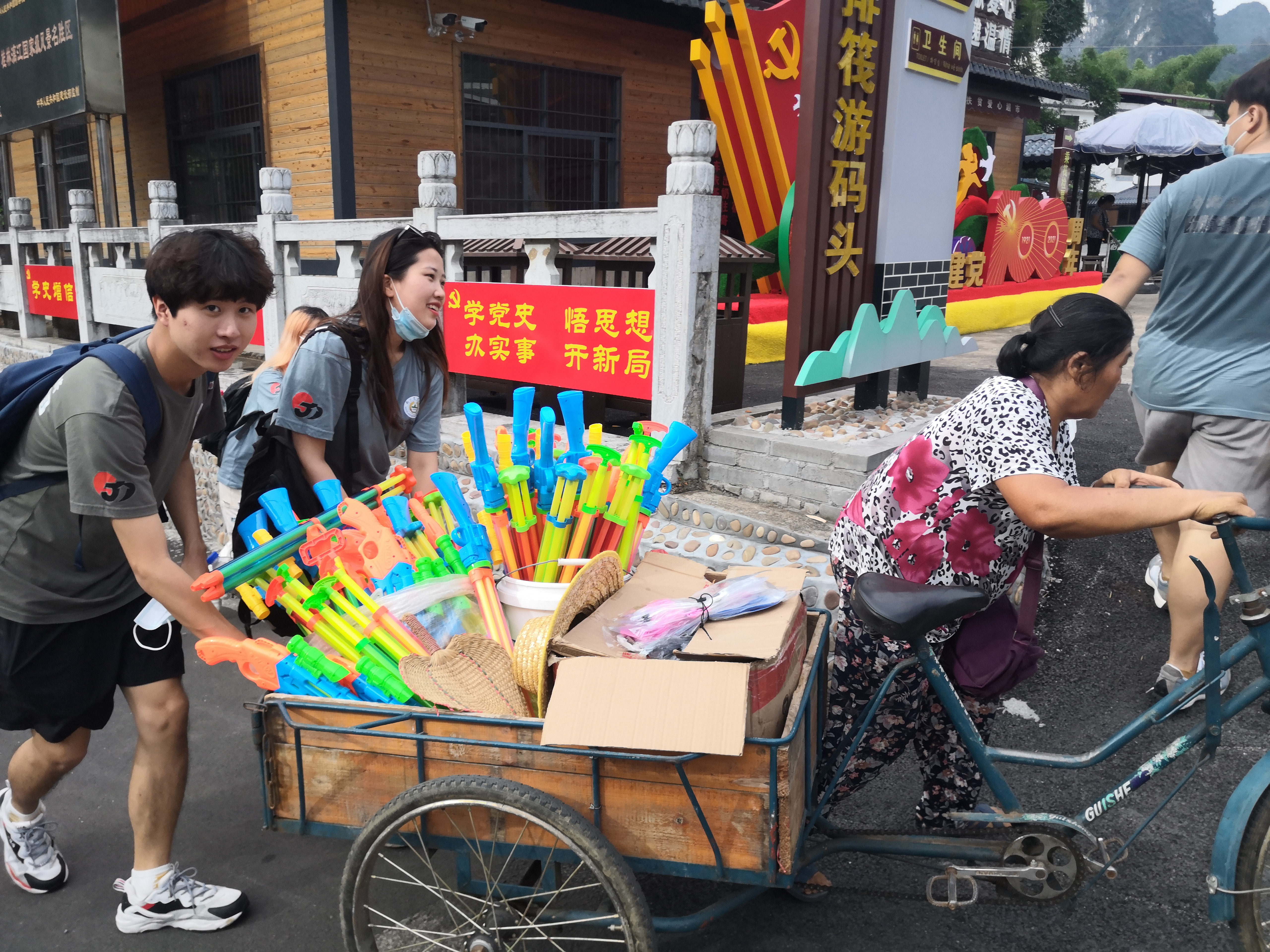 徒步漓江当然少不了步行,大家纷纷走下观光车,欣赏沿途美景,同时也不忘关注身边需要帮助的人。