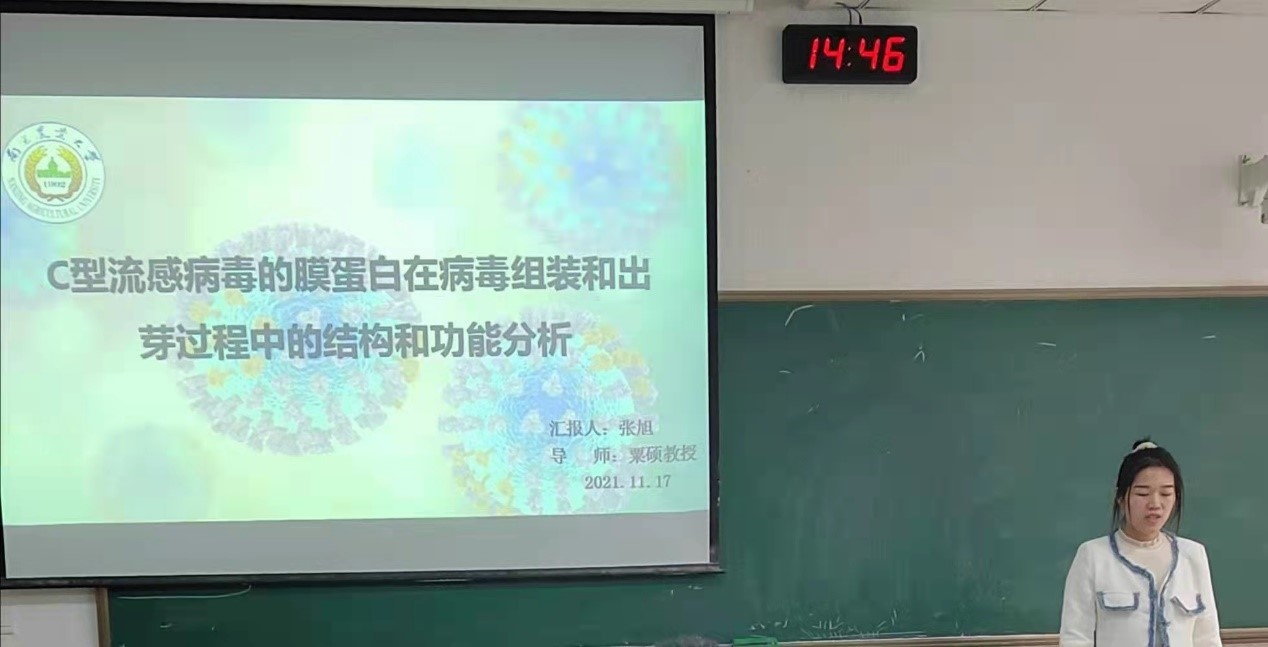 第二位是来自预防兽医学的张旭,她汇报的题目是《C型流感病毒的膜蛋白在病毒组装和出芽过程中的结构和功能分析》。本实验以C型流感病毒的三个膜蛋白HEF、CM1和CM2为研究对象,探究了它们在病毒组装及出芽过程中的重要作用,实验成果丰富,具有一定的应用价值和实践意义。评委老师们对该课题的创新性给予了高度的赞赏。