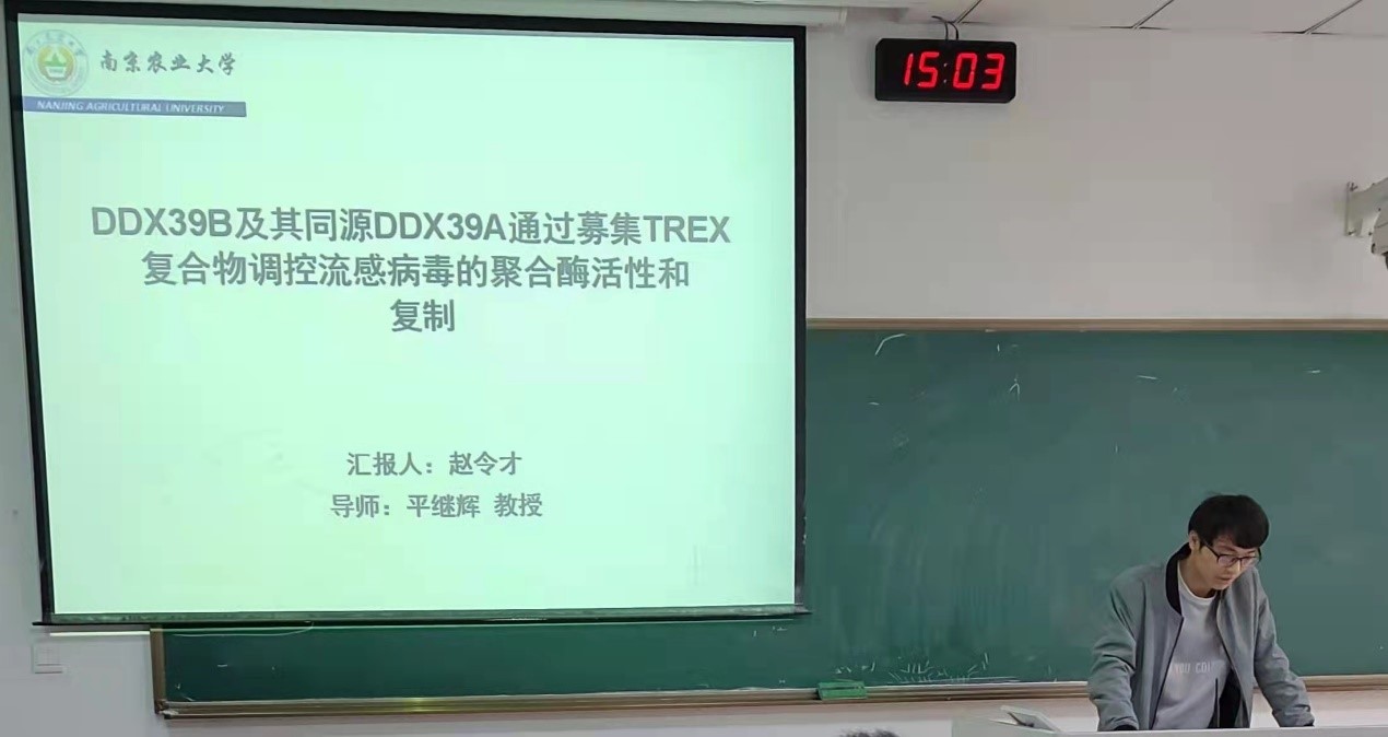 第三位汇报人是来自预防兽医学的赵令才,其汇报的题目是《DDX39B与其同源DDX39A双重调控流感病毒的聚合酶活性和复制》。该实验以人流感病毒作为模型,研究了DDX39B和DDX39A两种蛋白影响流感病毒聚合酶的活性和复制的机制,并最终绘制了DDX39B、DDX39A作用机制模式图。该汇报使在场同学受益匪浅。同学们也对于所讲解的课题进行了些许提问,大家相互交流,共同进步。