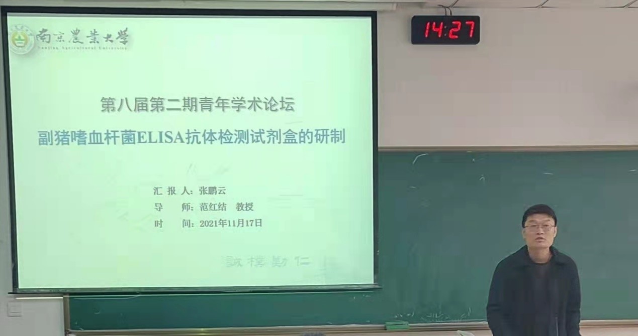 第一位汇报的是来自兽医专业的张鹏云,他汇报的题目是《副猪嗜血杆菌ELISA试剂盒的研制》。通过制备合适的抗原、对照血清等,制作出副猪嗜血杆菌ELISA试剂盒,其检测效果可以与国外试剂盒相媲美,且成本更低。吴宗福老师对其所汇报的课题给予了充分的肯定,同时也对该试剂盒的不足之处提出了些许宝贵的意见。