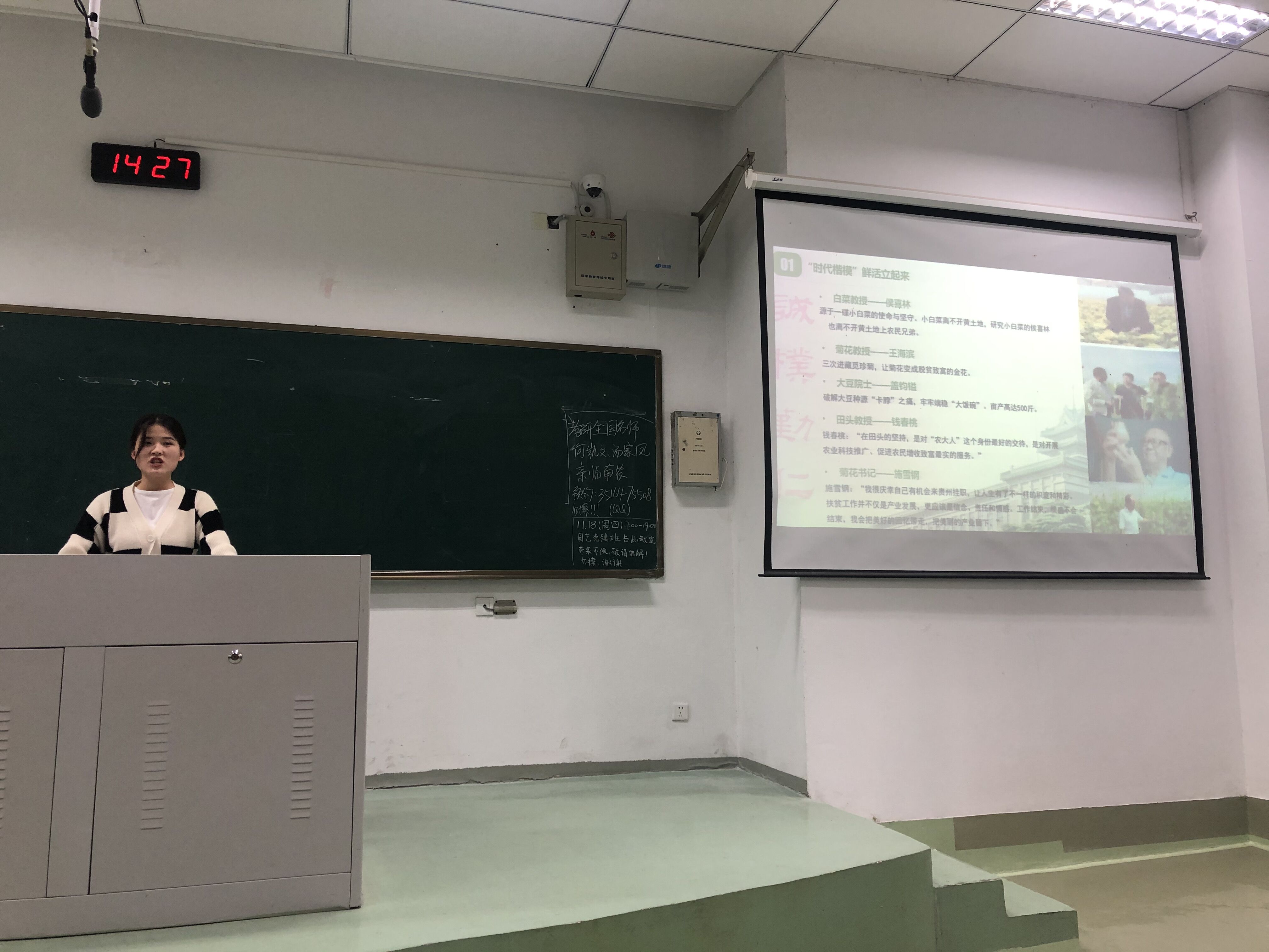 看南农科技成果,品南农风花雪月,王莹莹通过介绍蔬菜中的颜值派,玫瑰中的实力派——黄玫瑰白菜,十余种重瓣型、观赏价值高、瓶插期长的荷花和菊醉白马、傲艳金秋的校花菊花以及大豆、蓝莓等新兴产物,展现了南农人的科研成果和精神,打消了同学们认为科研很枯燥的观点。并以最美第一书记施雪钢的故事引出,“城里少一个大学生没什么,但是村里多一个就很了不起!”作为新时代的主力军,我们应当勇担重任,到乡村振兴一线去。