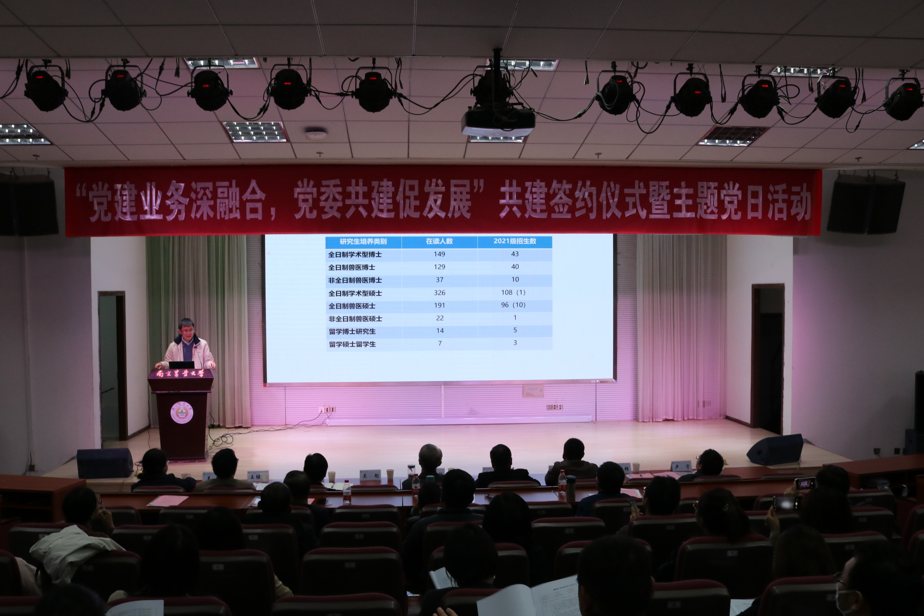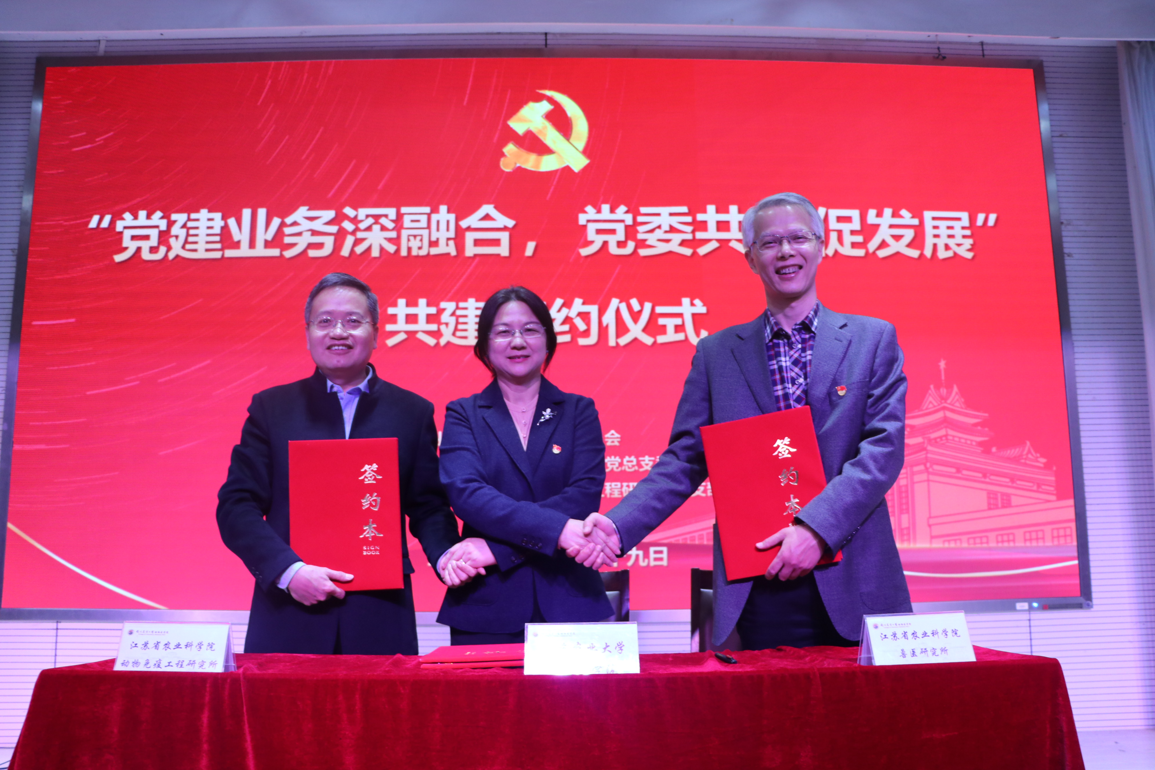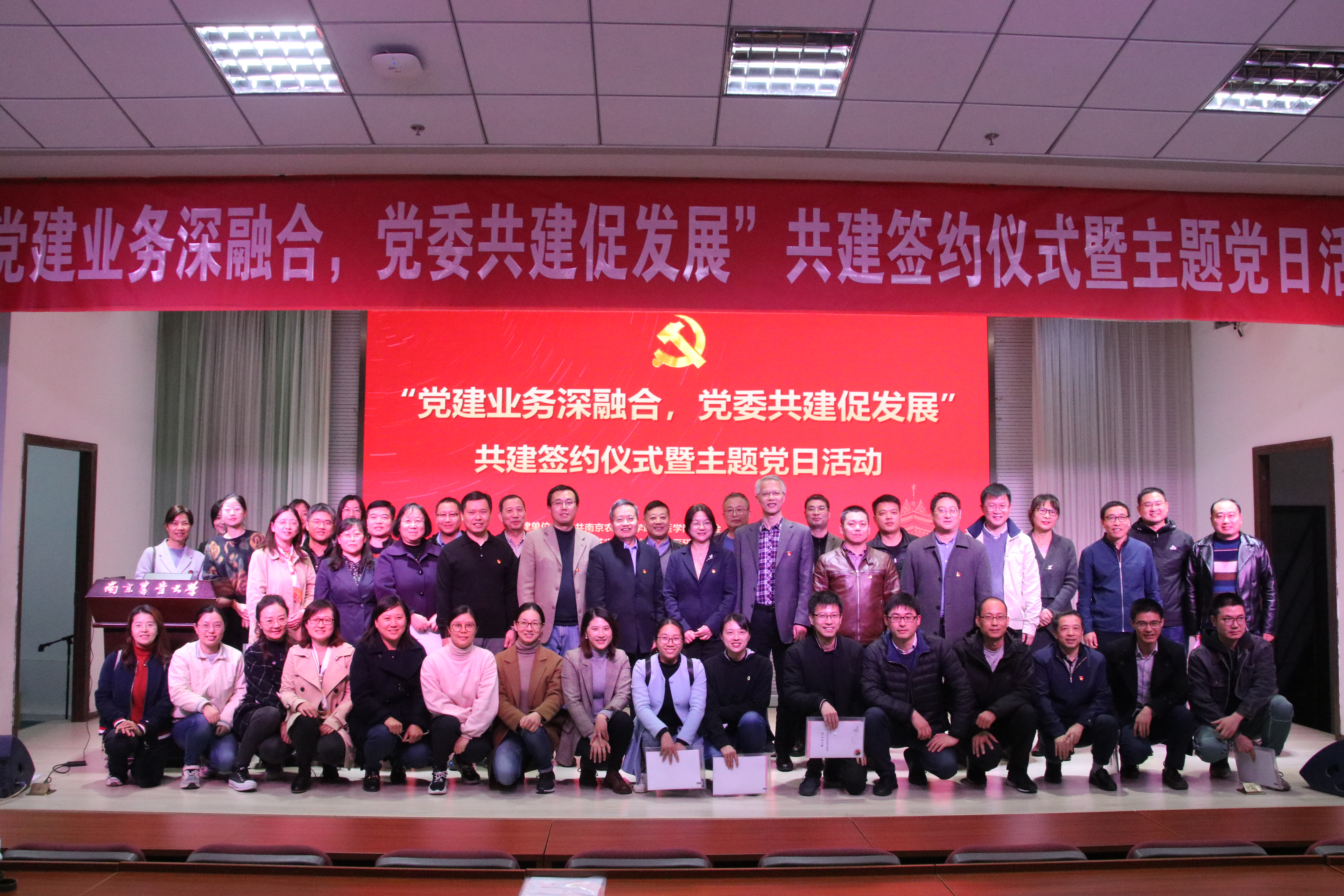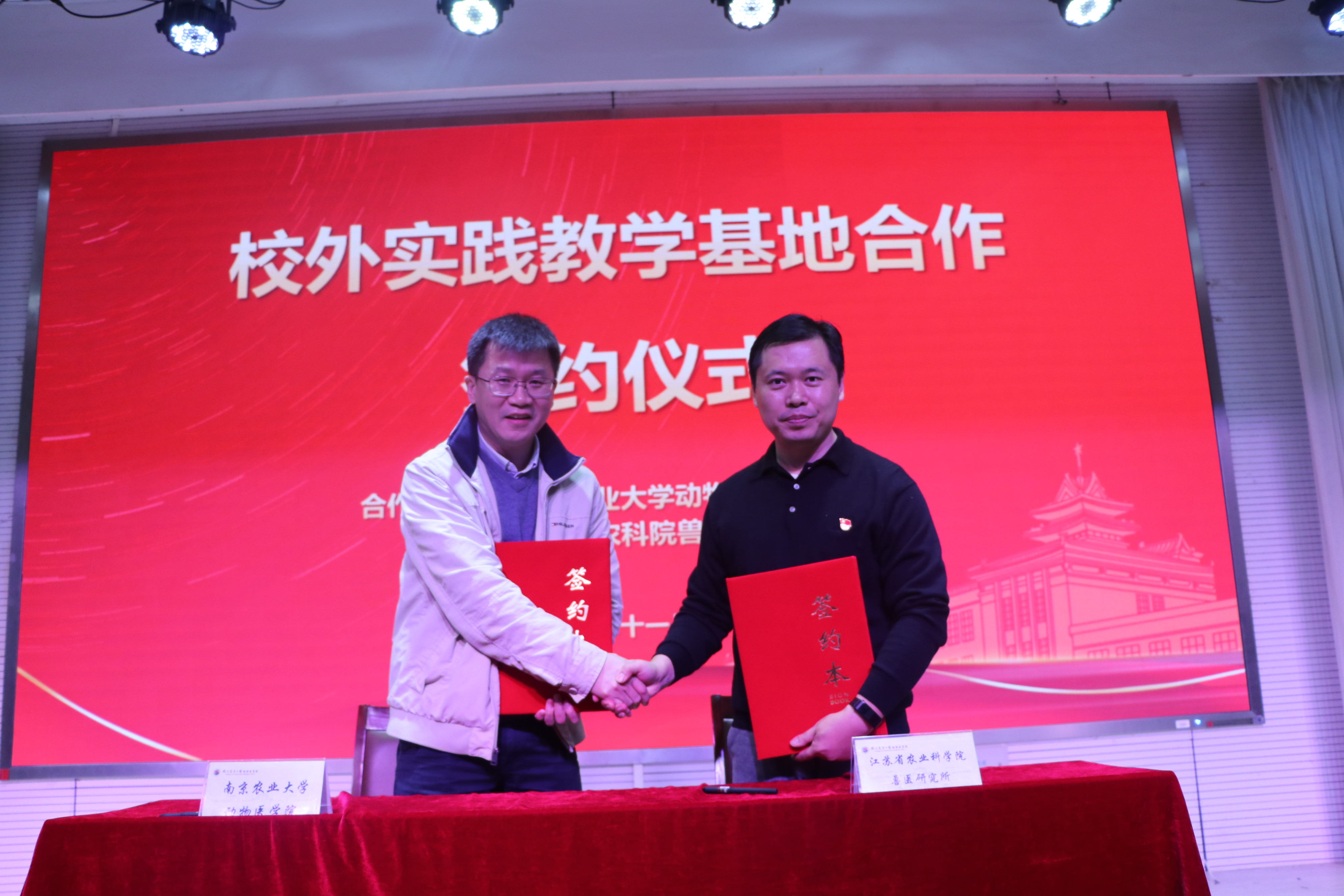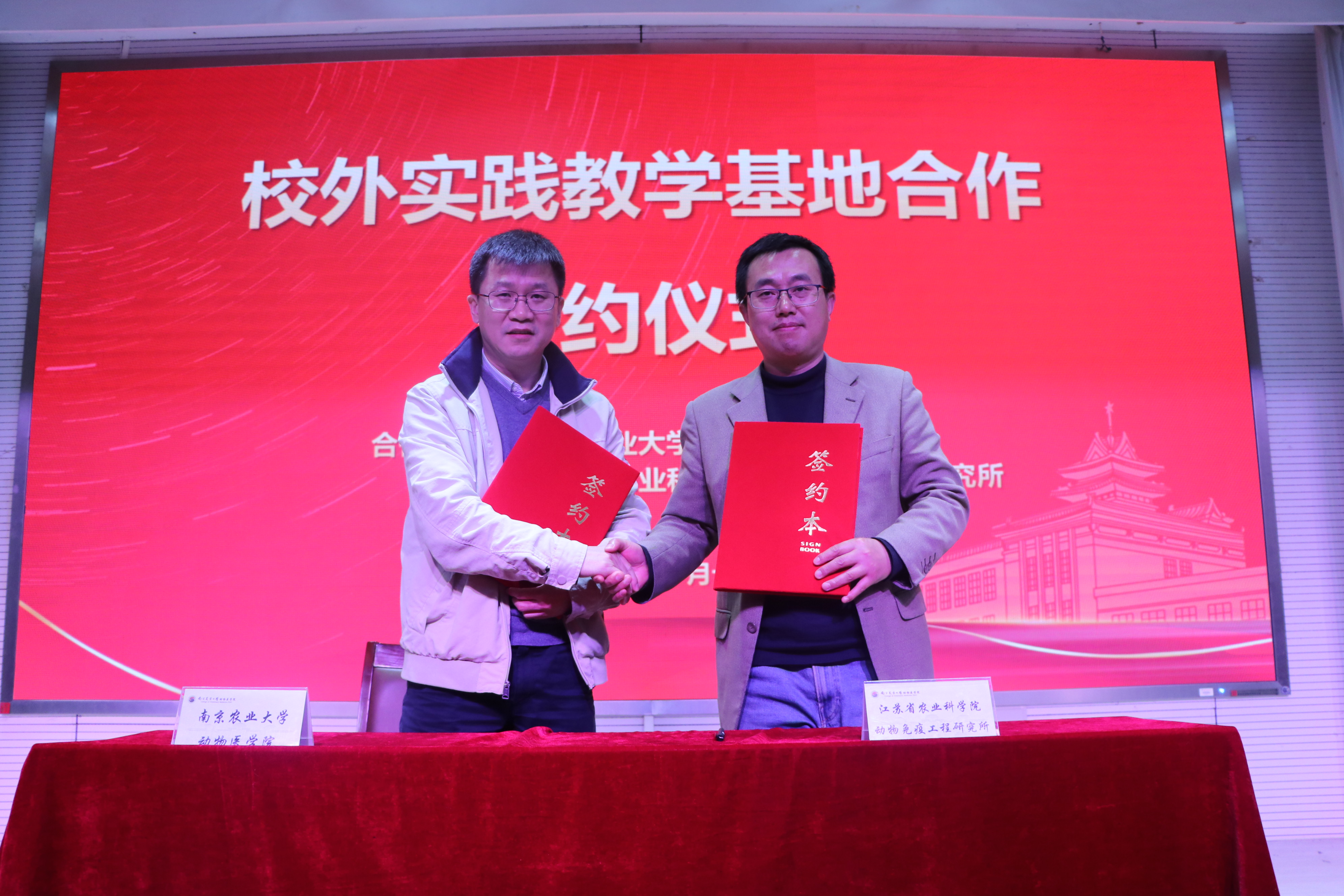 11月19日下午,“党建业务深融合,党委共建促发展”共建签约仪式暨主题党日活动在南京农业大学教四楼报告厅隆重举行。新葡萄8883官网AMG党委书记姜岩,副院长苗晋锋,江苏省农业科学院兽医研究所党总支书记李胜,所长李彬,副所长冯志新,江苏省农业科学院动物免疫工程研究所党总支书记、所长赵永前,副书记、副所长吴魁,副所长卢宇,副所长王继春出席仪式。新葡萄8883官网AMG党委成员代表、江苏省农业科学院兽医研究所党总支、免疫所党支部成员代表、兽医所、免疫所兼职研究生导师和新葡萄8883官网AMG研究生导师参加活动。仪式由姜岩主持。