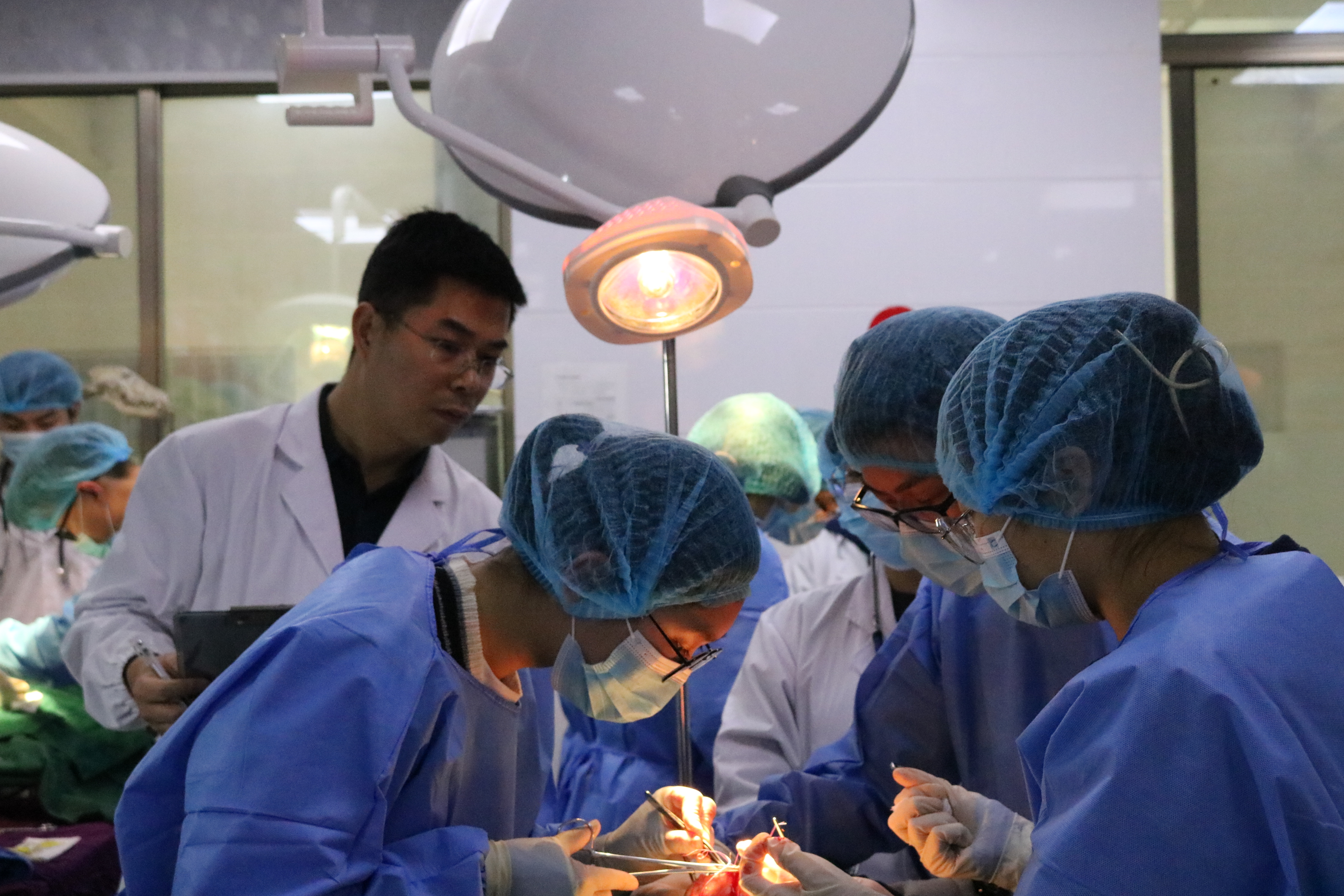 外科手术比赛的考察形式为兔胃的缝合手术,考察同学们对手术流程的了解情况和操作水平。随着评委老师宣布开始,选手们都有条不紊地开始了手术的各项工作,动作迅速的同时又保证了操作的准确性,充分发挥出了动医学子们的专业水平和强大心理素质。