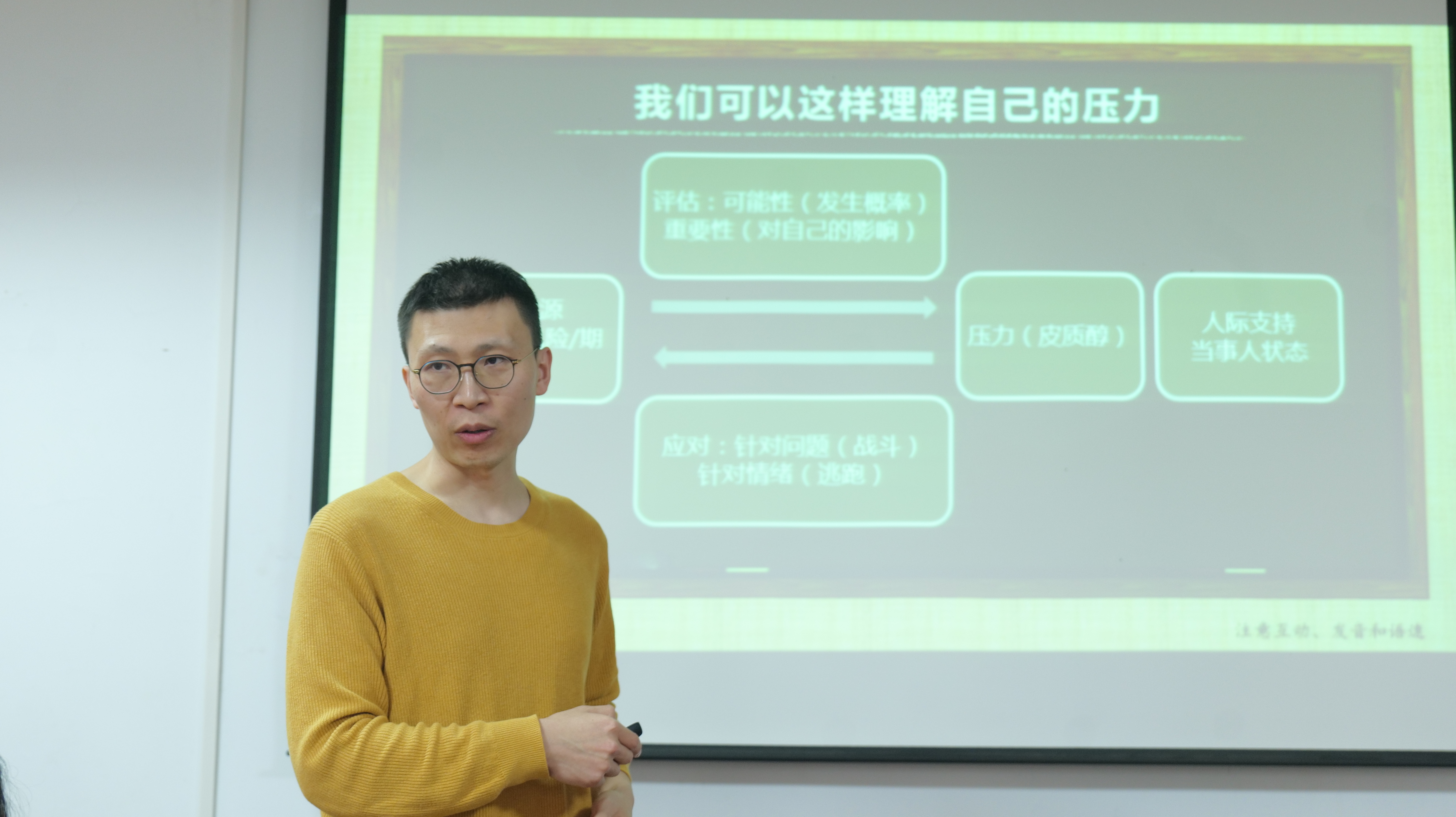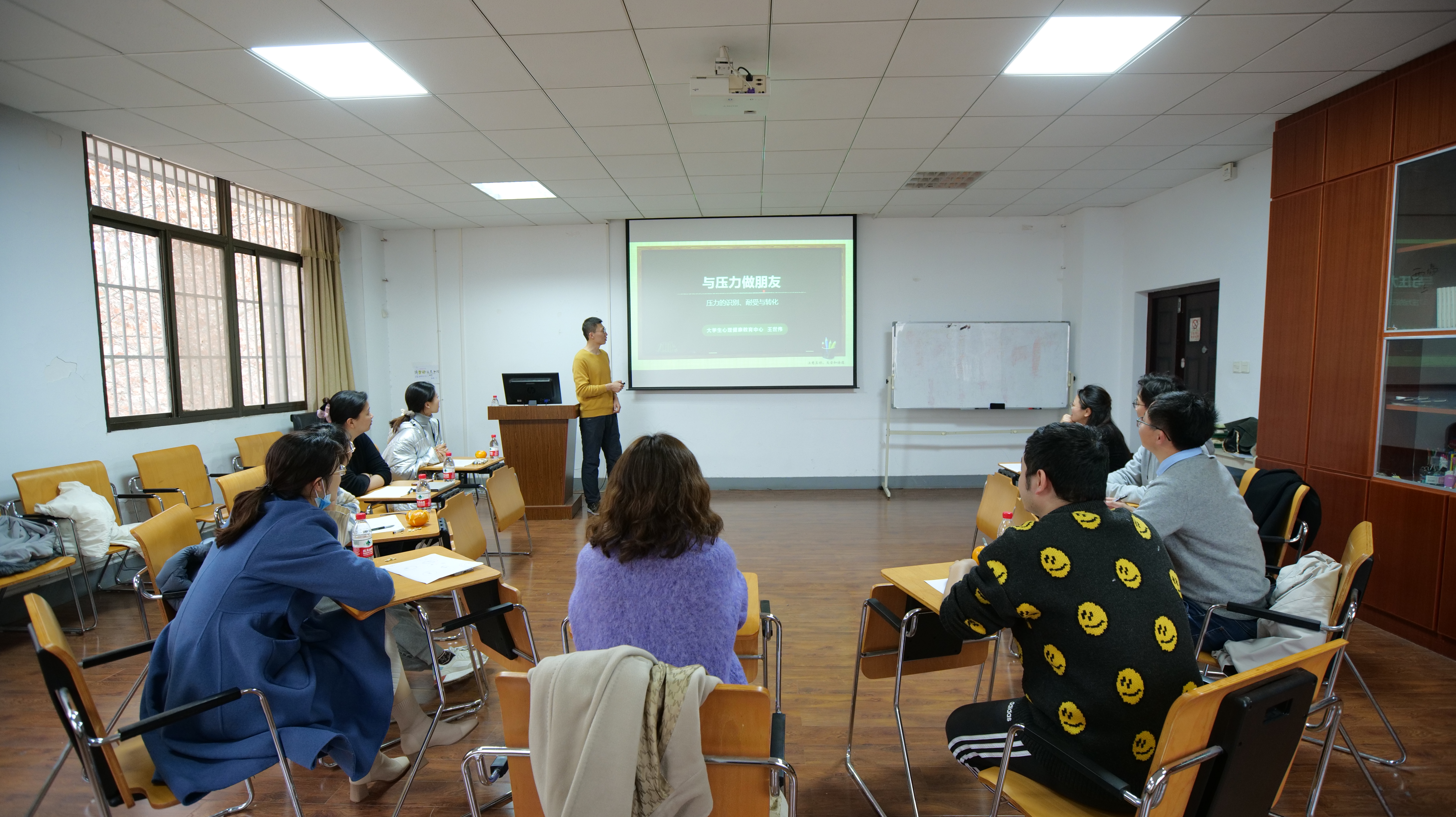 随后,在“朋辈课堂”环节,王世伟以“如何与压力做朋友”为题,通过压力站队、压力圈绘制等游戏破冰,引领与会人员探索压力应对的方法,辅导员们切身体验了以“压力”为主题的团体辅导,进一步提升了业务工作水平。