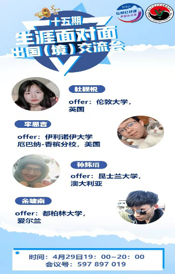 4月29日晚7:00,“生涯面对面出国(出境)交流会”在腾讯会议上成功开展。本期活动邀请了杜程悦、李思言、孙炜瑫、余啸南四位17级优秀学生代表。本场活动吸引力我院近121位本科生参与,学院辅导员李欣欣主持本次活动。