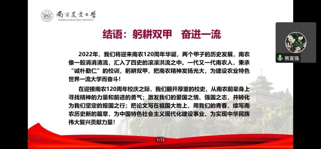第二部分,熊富强以“超一流的学术成果”为题,呼吁同学们用真才实学报效祖国人民。列举了我校一百二十年来的卓越科研成果,以及高端人才团队。百廿风雨,南农人的精神作为宝贵的精神财富,薪火相传。
