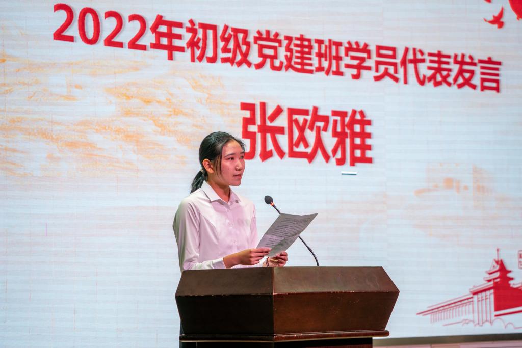 新发展党员孟圣睿和2022年初级党建班学员张欧雅作为代表发言。