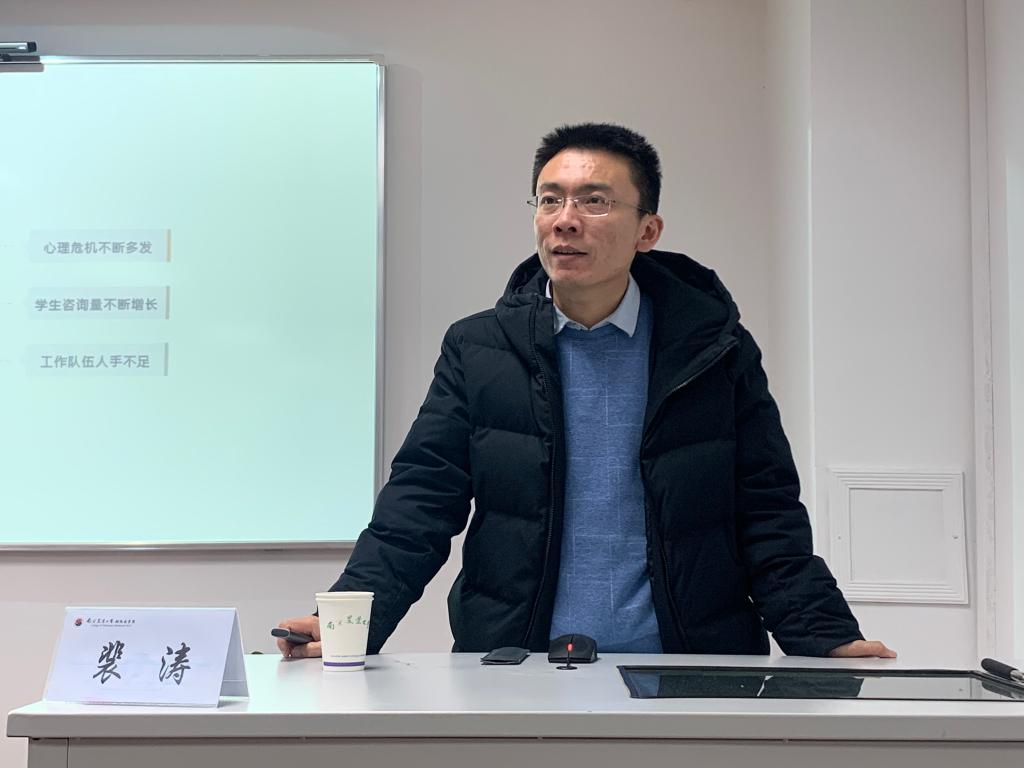 2023年3月21日下午,新葡萄8883官网AMG班主任工作实务培训之心理健康教育专题培训在逸夫楼3044顺利举办。本次培训主题为《大学生心理危机干预》培训由南京师范大学心理健康教育咨询中心临床总督导裴涛副教授主讲,学院全体班主任、辅导员、教学秘书参加了培训,报告由院党委副书记李云锋主持。