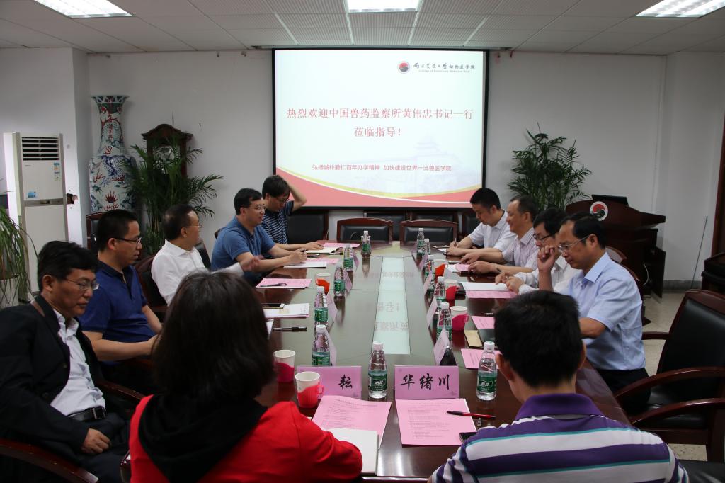 2018年6月9日上午,中国兽医药品监察所黄伟忠书记、梁先明副处长、曲鸿飞副处长、赵耘研究员、江苏省兽药饲料质量检验所姜加华所长、毕昊荣副所长、华绪川科长一行7人来到我校调研新兽药研发和申报工作。南京农业大学副校长戴建君教授、新葡萄8883官网AMG党委书记范红结教授、副院长曹瑞兵教授、预防兽医系主任姜平教授和办公室主任杨亮陪同调研。