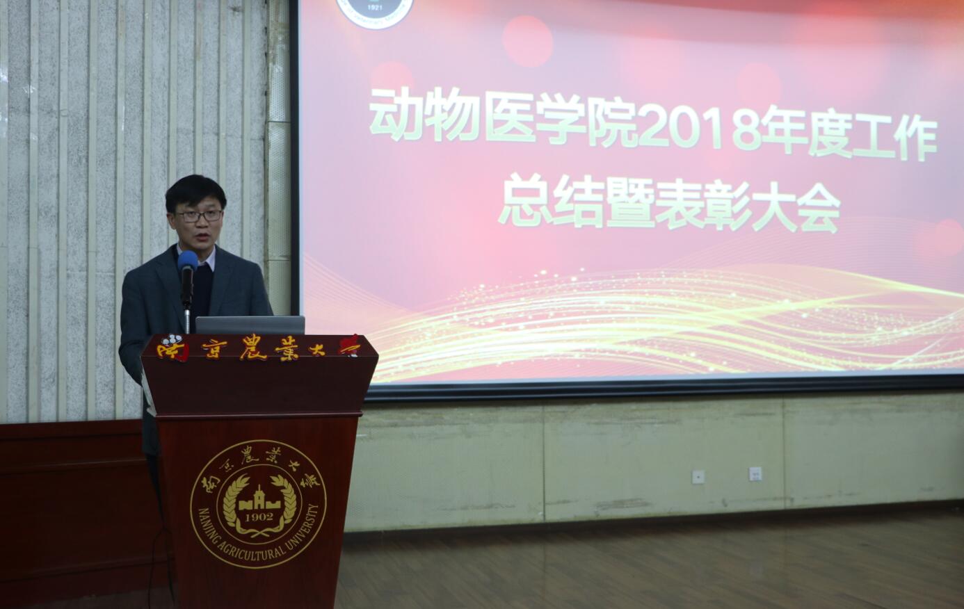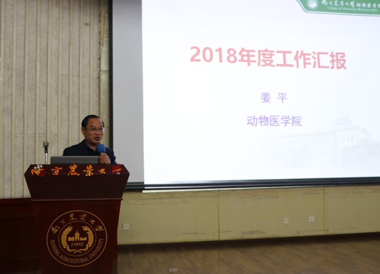 接着,院长姜平作了学院2018年度学院工作总结报告。姜平从优质资源建设、师资队伍建设、人才培养工作、科学研究工作、国际合作与交流等方面总结了2018年学院工作开展思路以及已经取得的一些工作成效,姜平2018年学院在新一届领导班子和全体教职工的共同努力下,尤其是在师资队伍建设、人才培养和科学研究等方面取得了显著成绩,成绩来之不易,在2019年,学院将继续围绕存在的问题制定兽医学科振兴计划,希望全院教职工凝心聚力,共同努力,不畏困难,全力推进兽医学科建设。