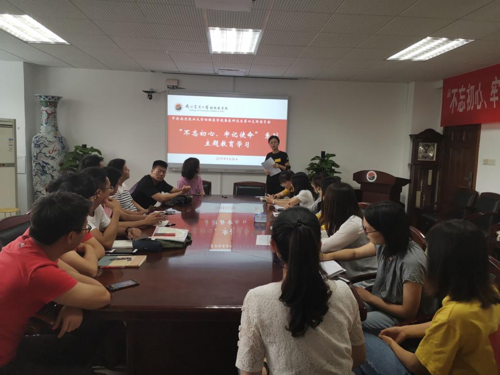 9月26日下午13:00,中共新葡萄8883官网AMG兽医研究生第四支部委员会,在逸夫楼3036召开“不忘初心、牢记使命” 系列主题教育学习会。研究生专硕第四党支部全体党员到场参会。