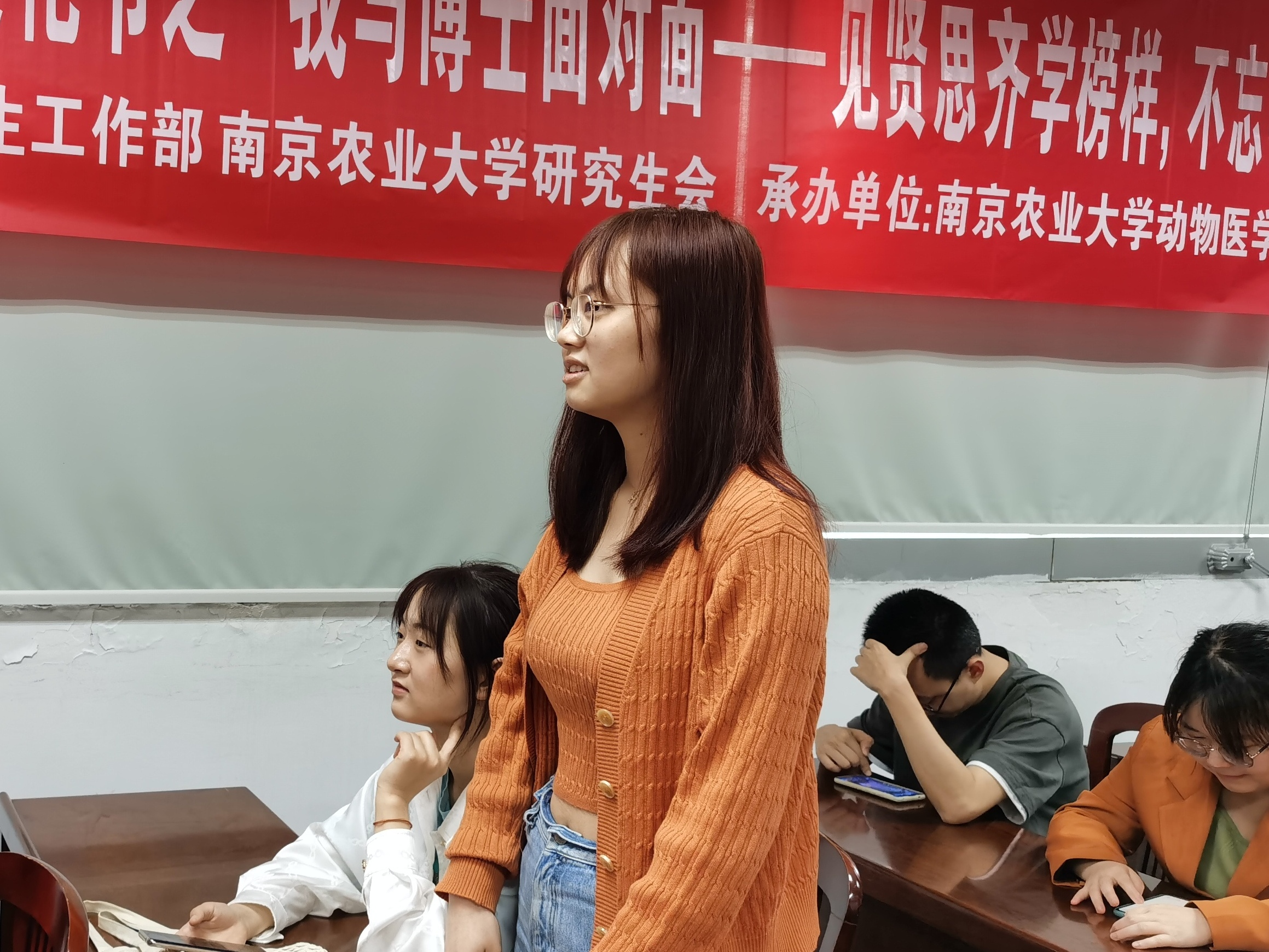 在主持人许秋华的介绍下活动拉开了帷幕,同学们热情鼓掌欢迎每一位嘉宾的到来。第一位与大家进行交流的是学院2017级临床兽医系博士研究生刘丹丹师姐。刘丹丹师姐的演讲紧紧围绕主题“你的坚持终将美好”展开,她像一位大姐姐一样和大家亲切交流,将自己读研这些年的亲身经历和心路历程娓娓道来,对大家的读研目标和制定规划提出了非常多实用的建议,参与交流的同学们都受益匪浅。