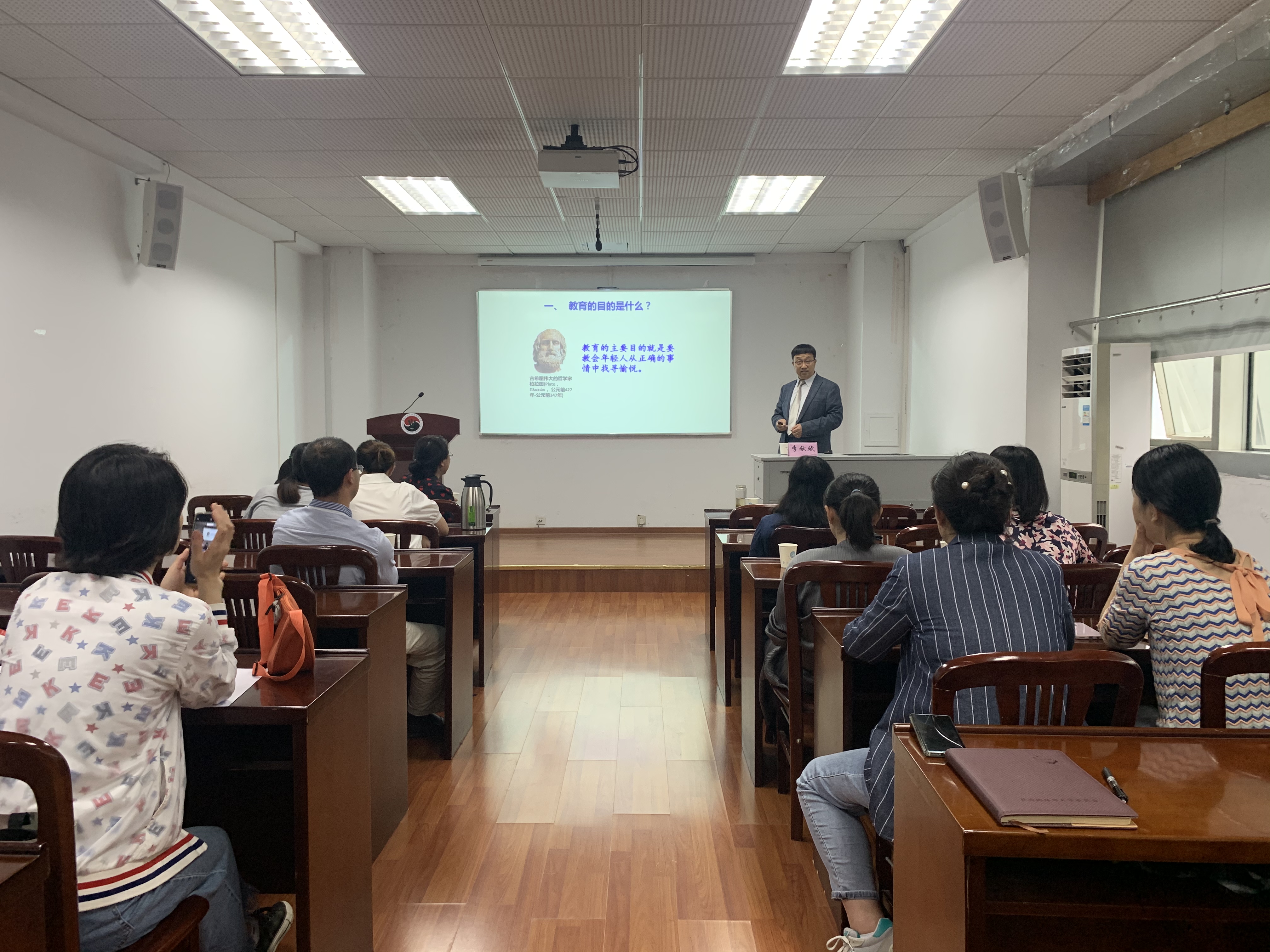 李献斌以《教师如何成为学生心灵的使者》为题,以儒家思想等中国传统文化和教育心理学的知识为基础,结合案例,生动展示了教师成为心灵使者的过程,转变教育观念,以学生为中心,开展启发式教学,开展心理健康教育,引导教师运用理性情绪疗法的ABC理论,帮助学生阳光心态、管理情绪、理解生命的意义。