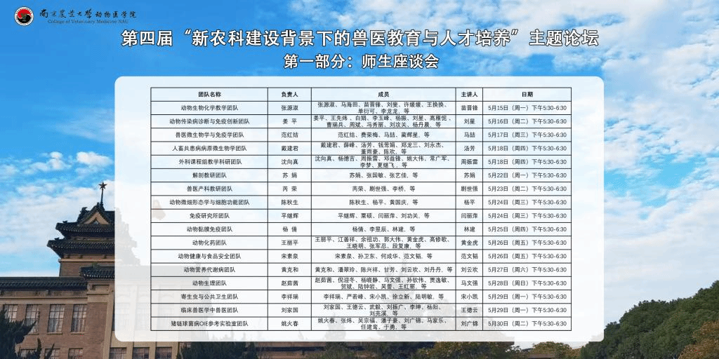 5月15日至5月30日,学院第四届“新农科建设背景下的兽医教育与人才培养”主题论坛第一阶段师生座谈会活动顺利举办。半个月里,基础兽医学、预防兽医学、临床兽医学3个专业方向,17支科研团队分17个场次,共计300余人次本科生参加了本次活动。