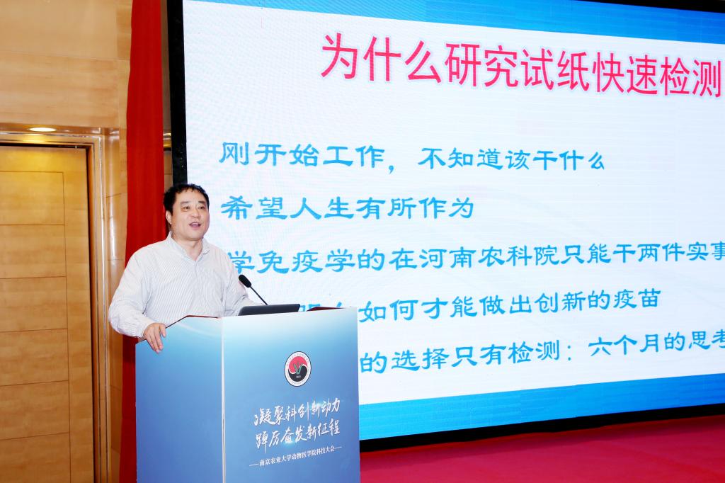 张改平作《从试纸快速检测技术谈起》主题报告,他以研究试纸快速检测技术为例深刻阐释了如何选择研究方向,满足国家重大需求,独创研究思路。他结合自身科研工作经历,勉励广大教师,要敢于探索未知领域,解决行业未解难题。