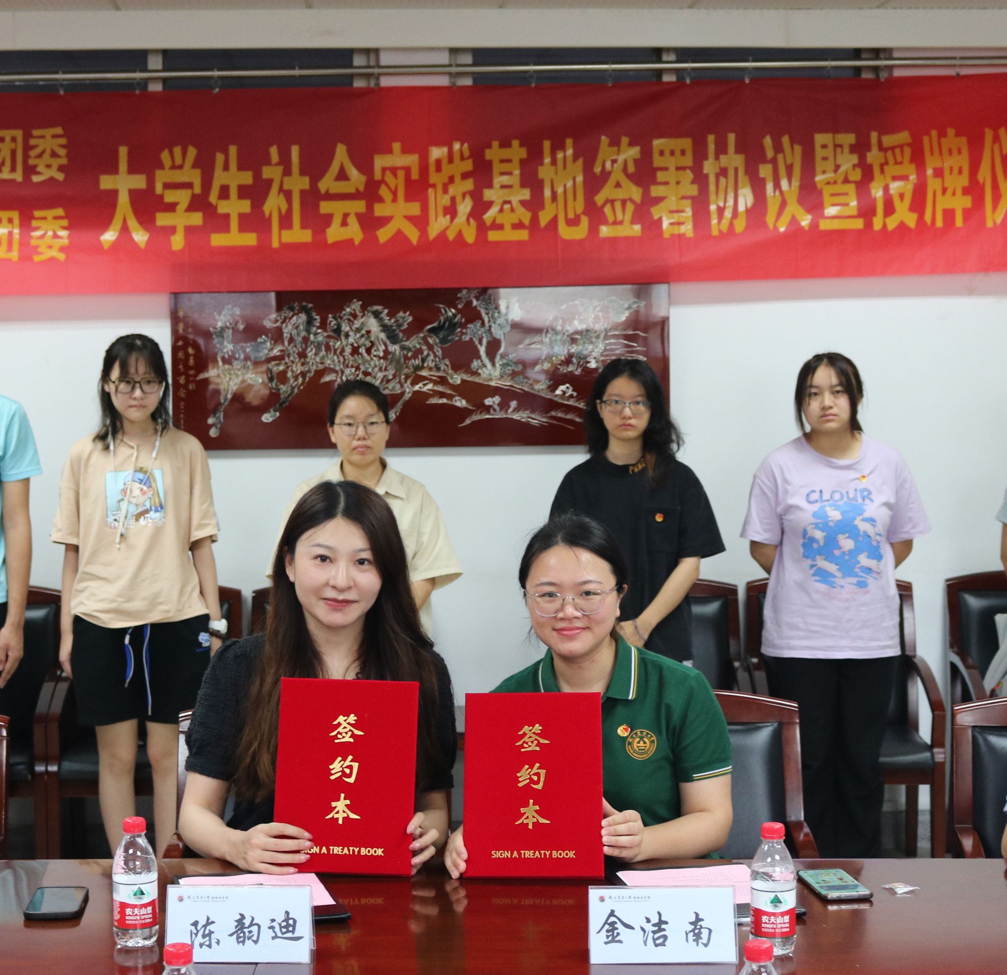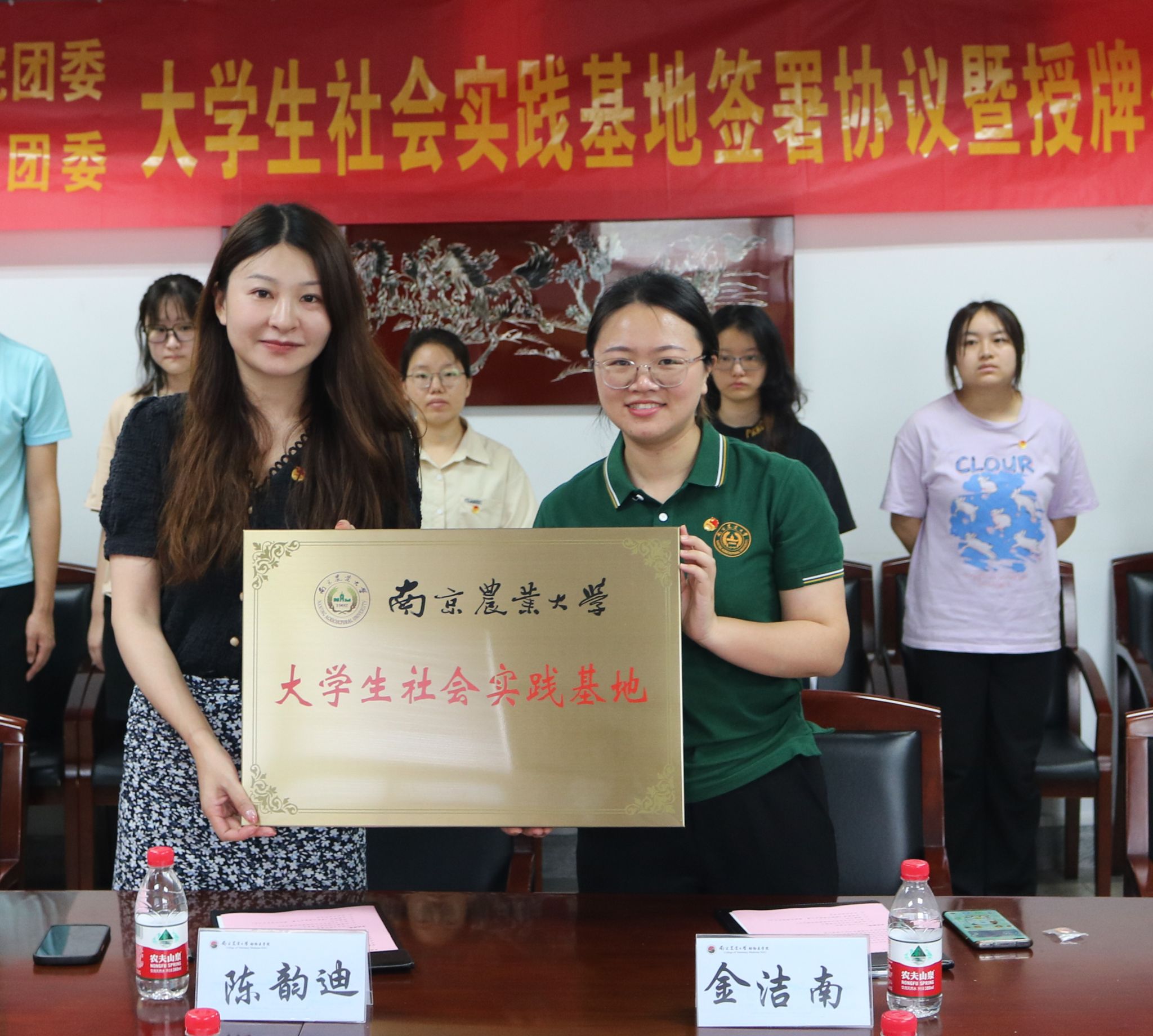 金洁南、陈韵迪分别代表双方签订了大学生社会实践基地共建协议,并进行了授牌。陈韵迪对志愿者工作给予了肯定,并表示南京市中西医结合医院与南京农业大学在地理位置、合作基础、人员配备等方面均具有一定的优势,希望下一阶段双方合作能够更深入、更成体系。