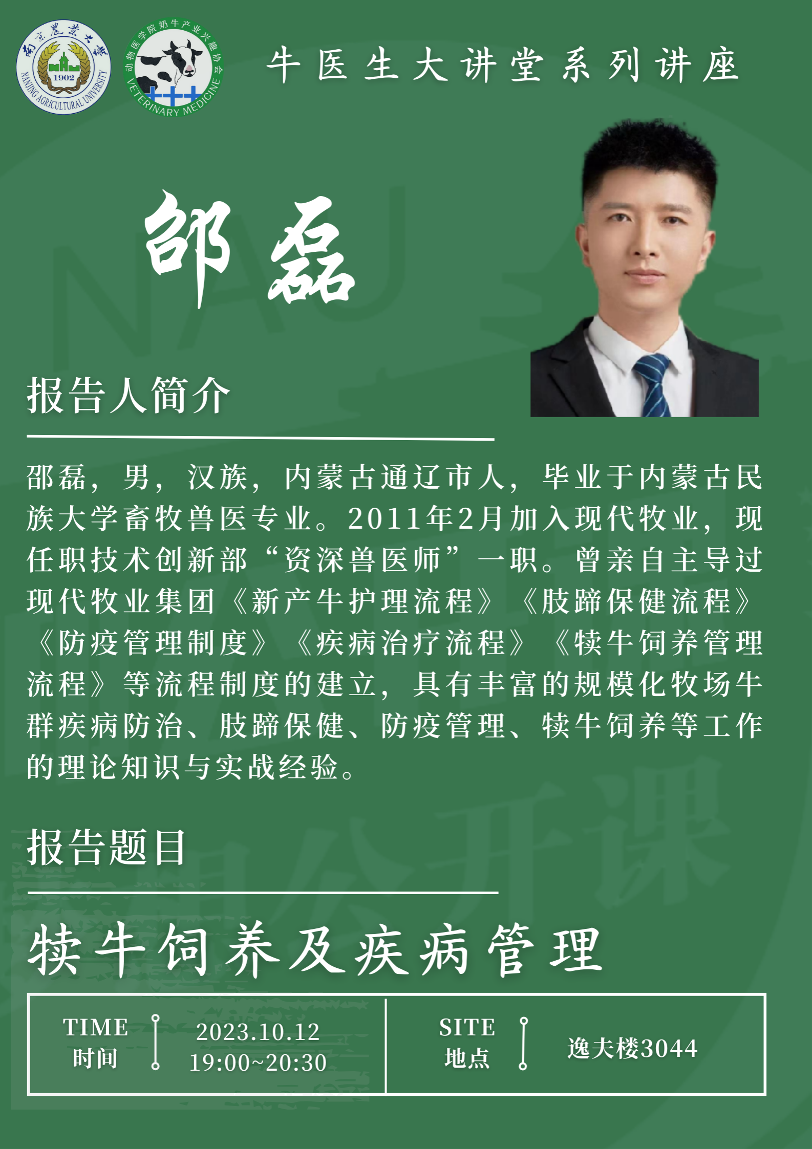10月12日晚,学院2023年“牛医生”训练营首期报告在逸夫楼3044顺利举行,现代牧业集团资深兽医师邵磊受邀开展《犊牛饲养及疾病管理》主题讲座,80余名学员通过线上直播参与讲座。活动由新葡萄8883官网AMG奶牛产业兴趣协会主办。
