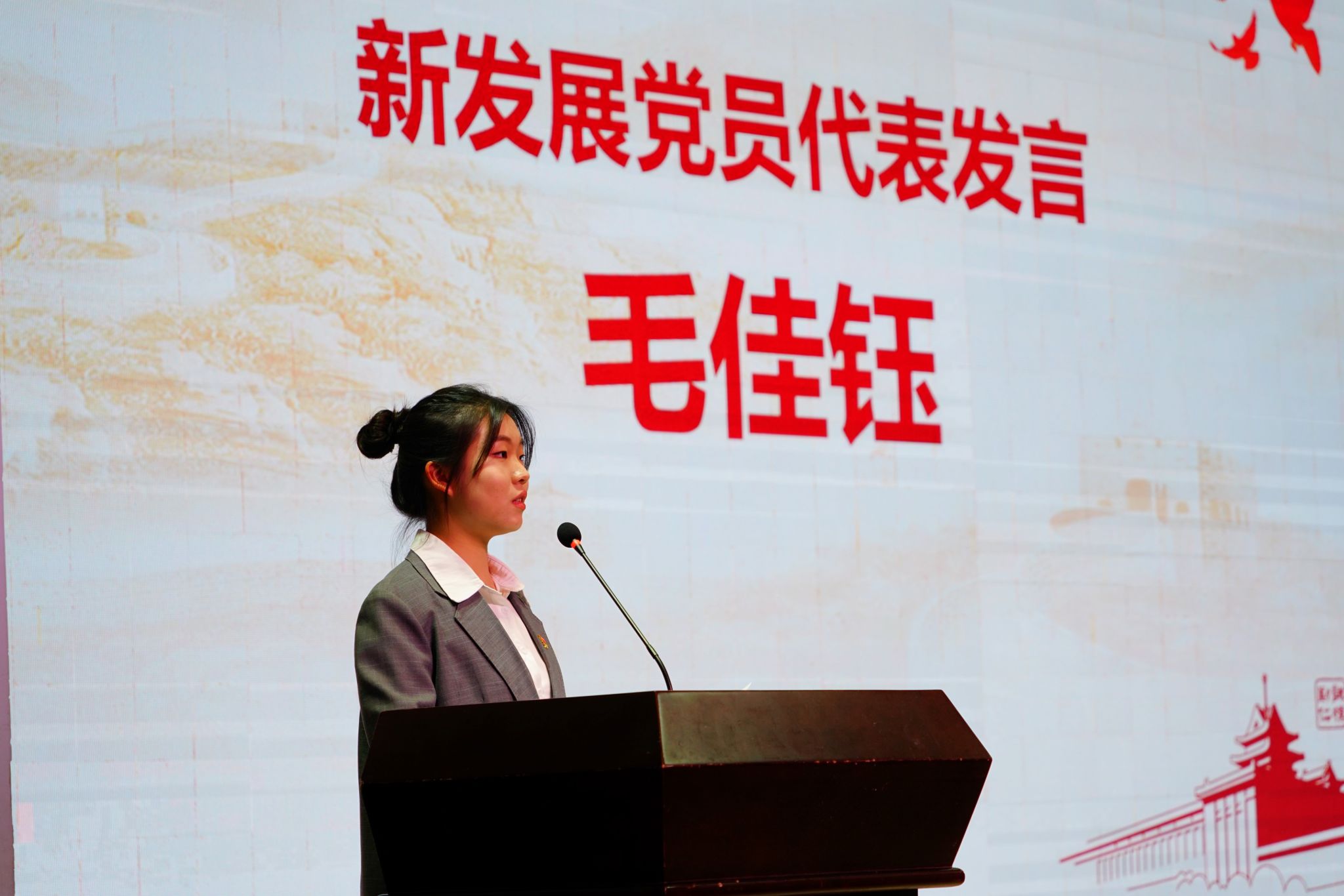 新发展党员毛佳钰和2023年初级党建班学员张皓然作为代表发言。