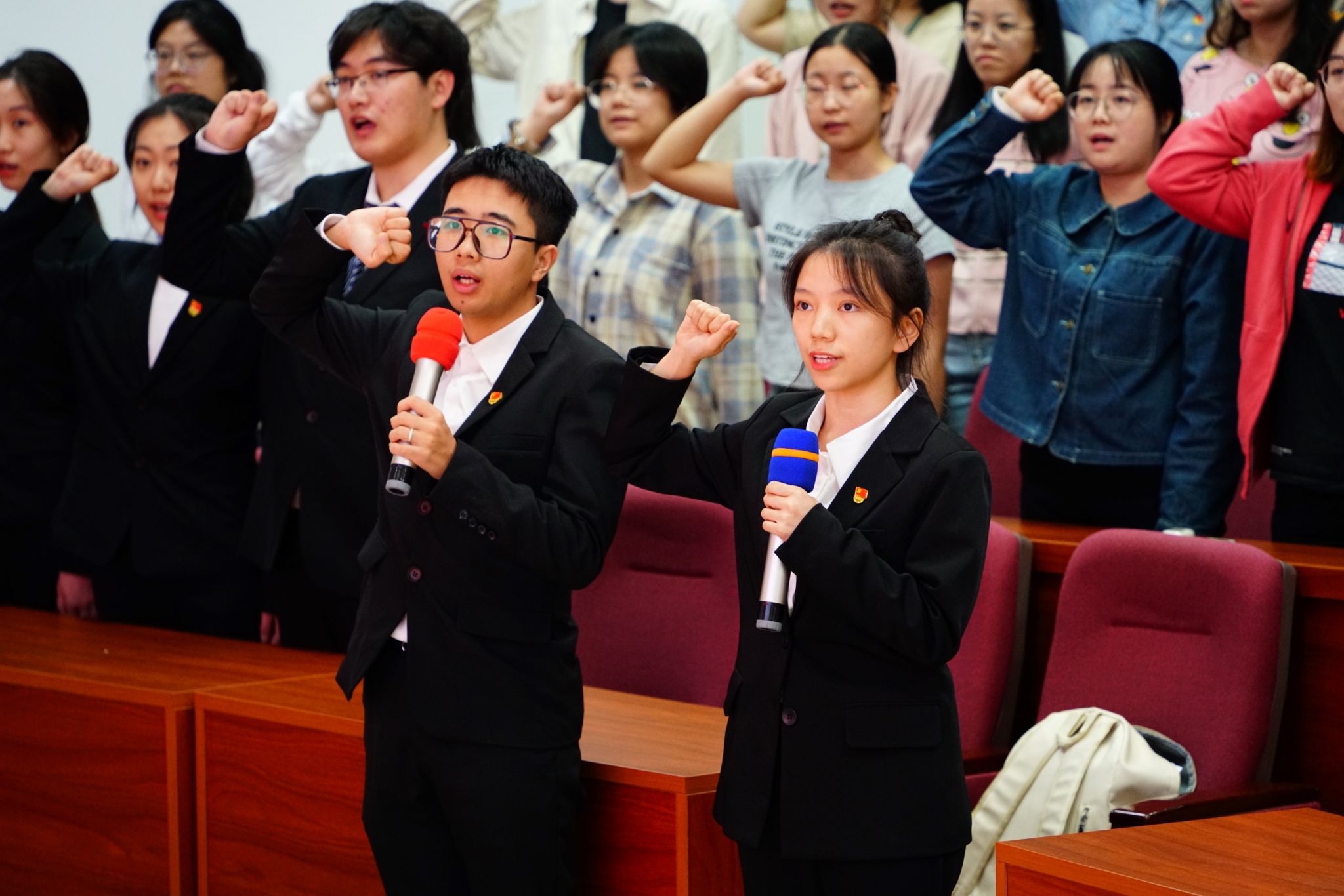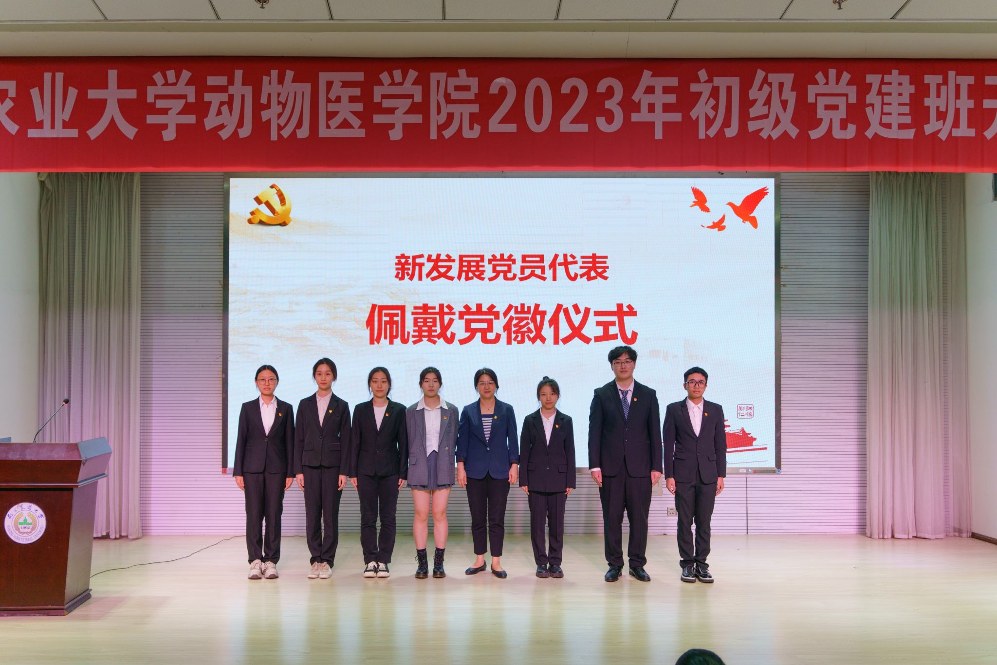 开班典礼上,李云锋宣读了2023年上半年和下半年新发展党员名单。姜岩为7位新发展党员代表佩戴党徽,62位新发展党员面对党旗庄严宣誓宣誓。