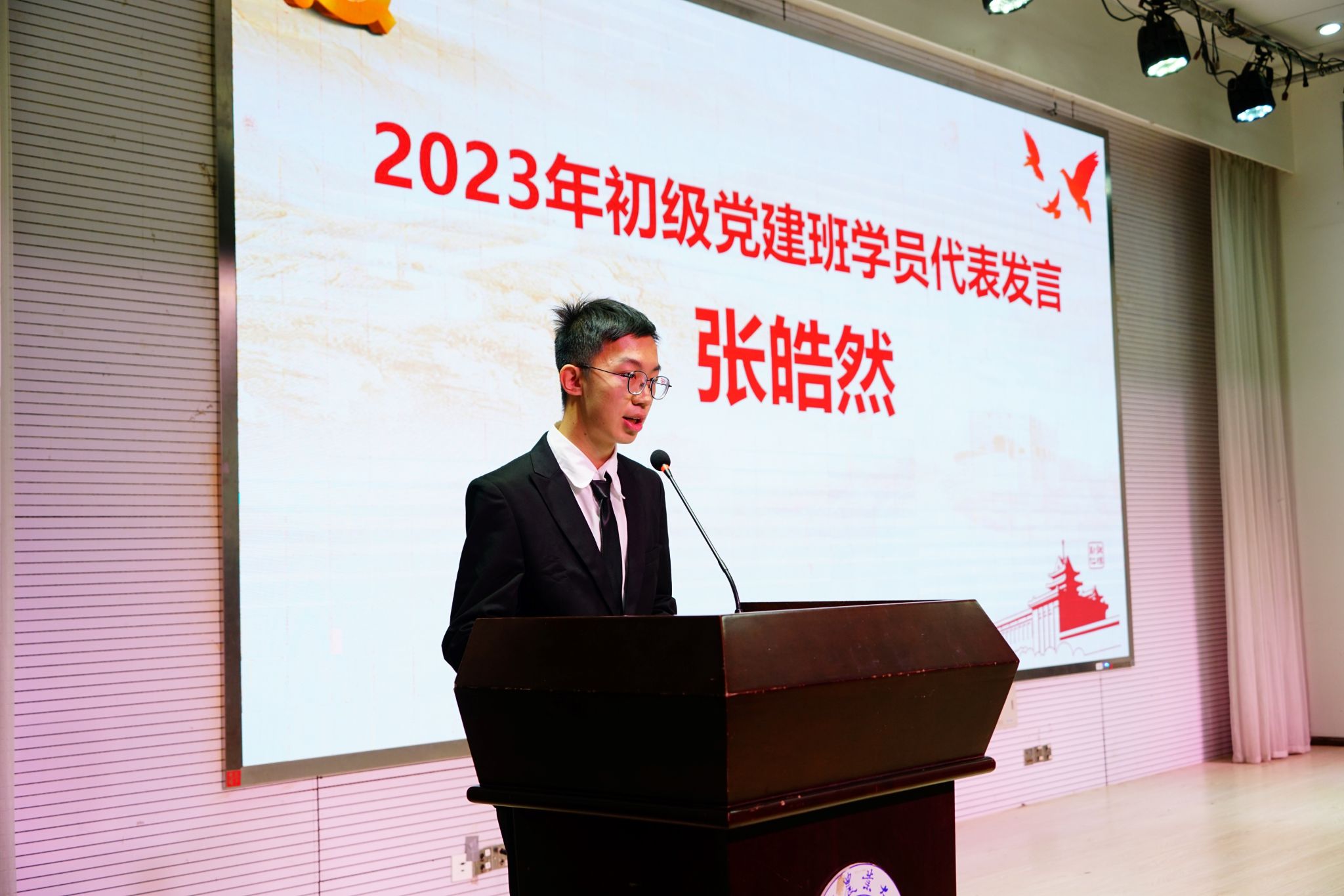 姜岩对参加典礼的同学提出要求并宣布2023年初级党建班正式开班。