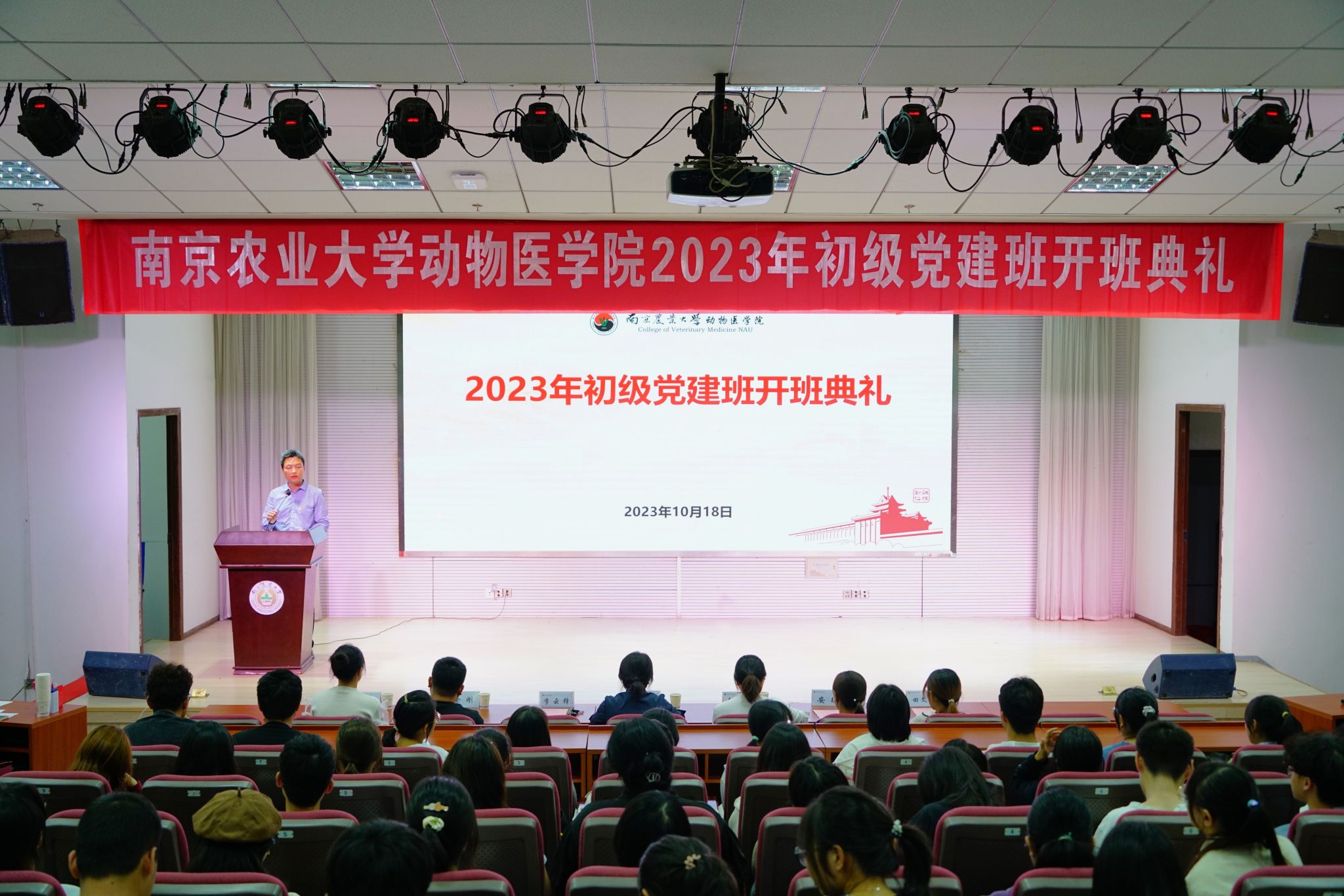 10月18日下午,学院2023年初级党建班开班典礼于教四楼报告厅举行。院党委书记姜岩、党委副书记李云锋出席典礼,辅导员金洁南、徐刚、李欣欣、安琪、汪明佳、田文秀,2023年新发展党员以及2023年初级党建班学员参加了活动。此次典礼由李云锋主持。