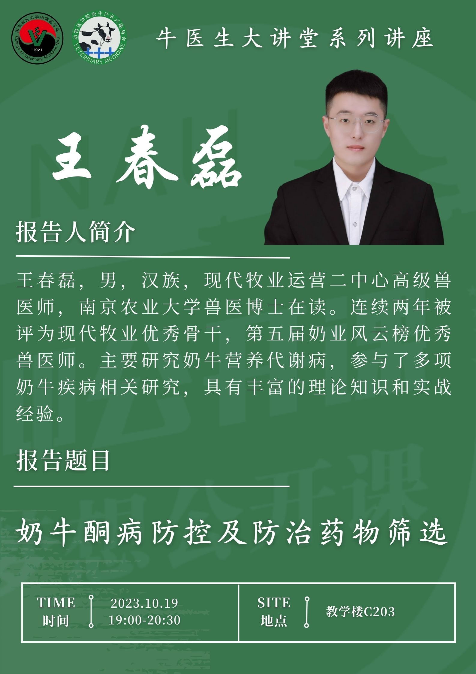 10月19日晚,学院2023年“牛医生大讲堂”专题培训第二期在教学楼C203如期举行。本次培训主题为“奶牛酮病防控及防治药物筛选”,由现代牧业集团高级兽医师王春磊主讲,吸引了百余名学生参加。