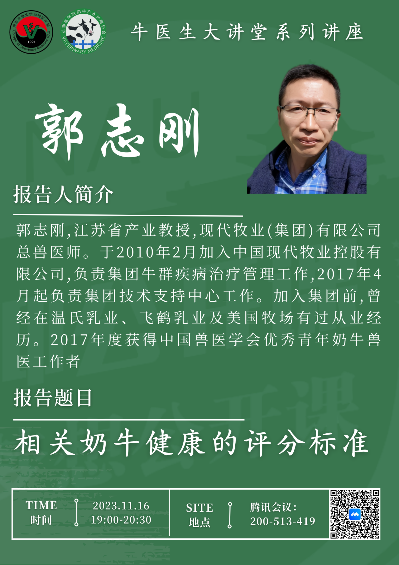 11月16日晚,学院2023年“牛医生大讲堂”专题培训第五期在主楼102如期举行。本次培训主题为“相关奶牛健康的评分标准”,由现代牧业总兽医师郭志刚主讲,吸引了百余名学生参加。
